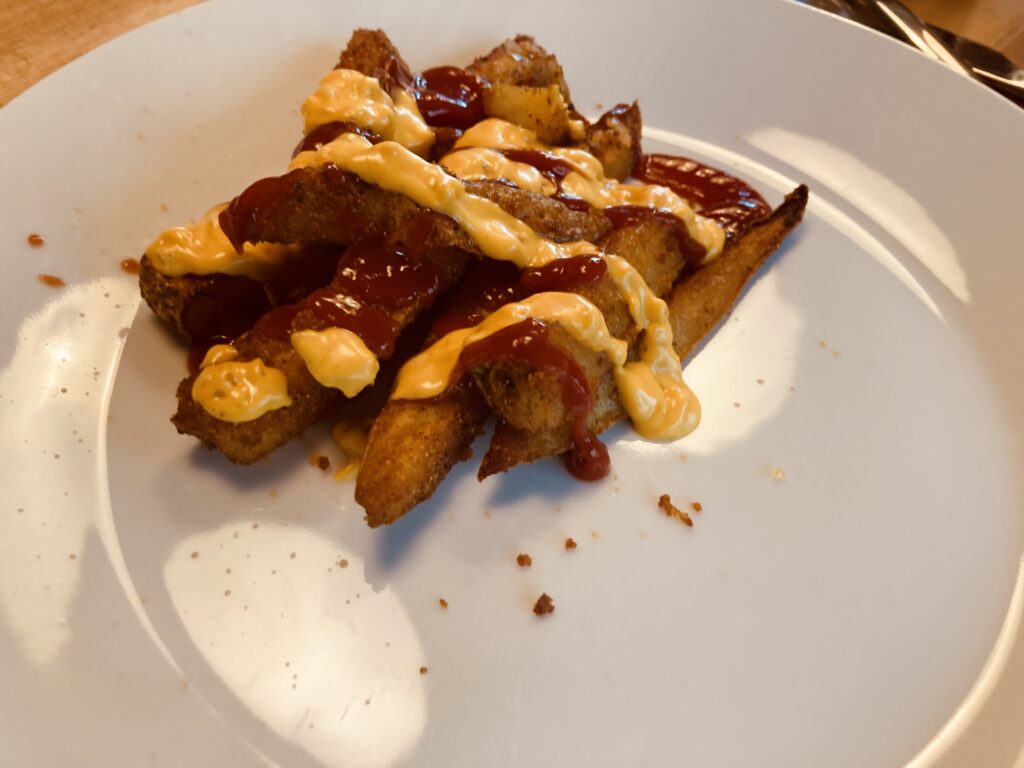 Dazu passen Mayonnaise, Remoulade, Ketchup, wie Ihr sie hundertfach in meinem Blog findet.