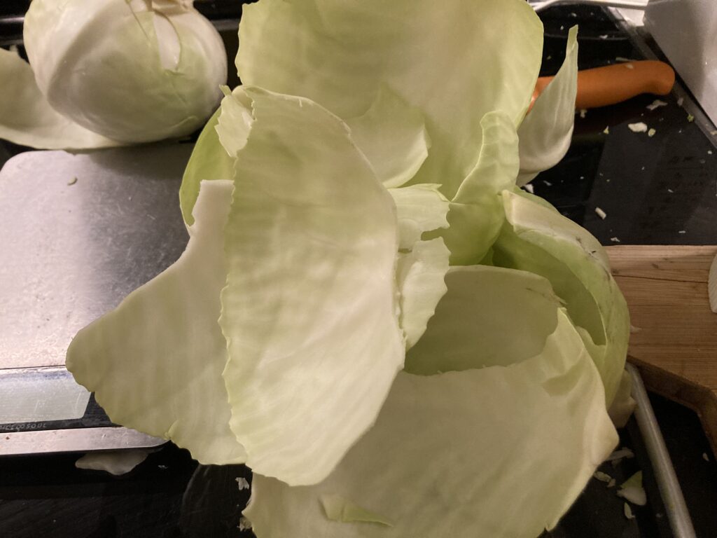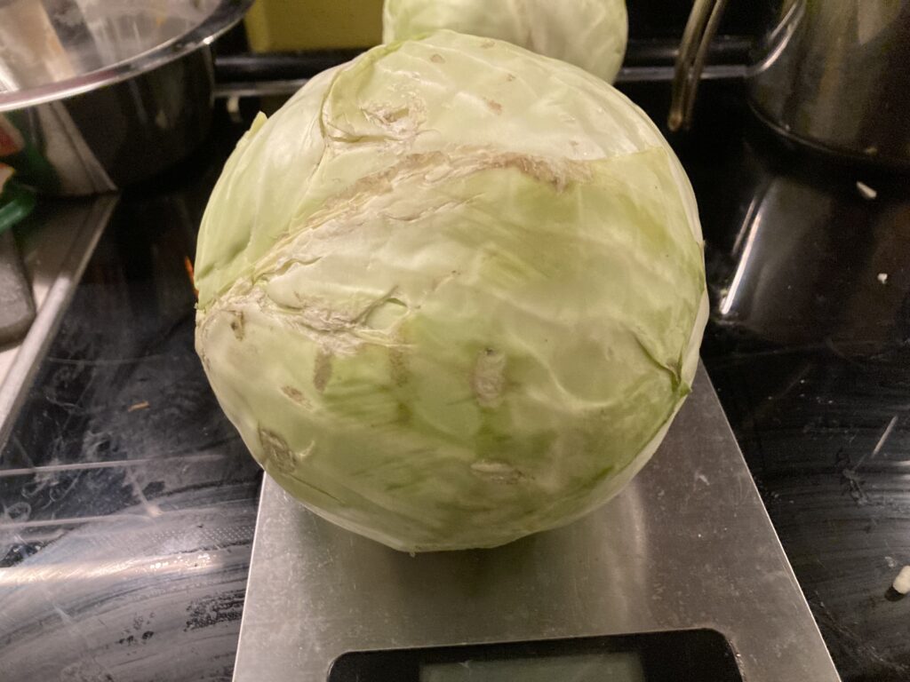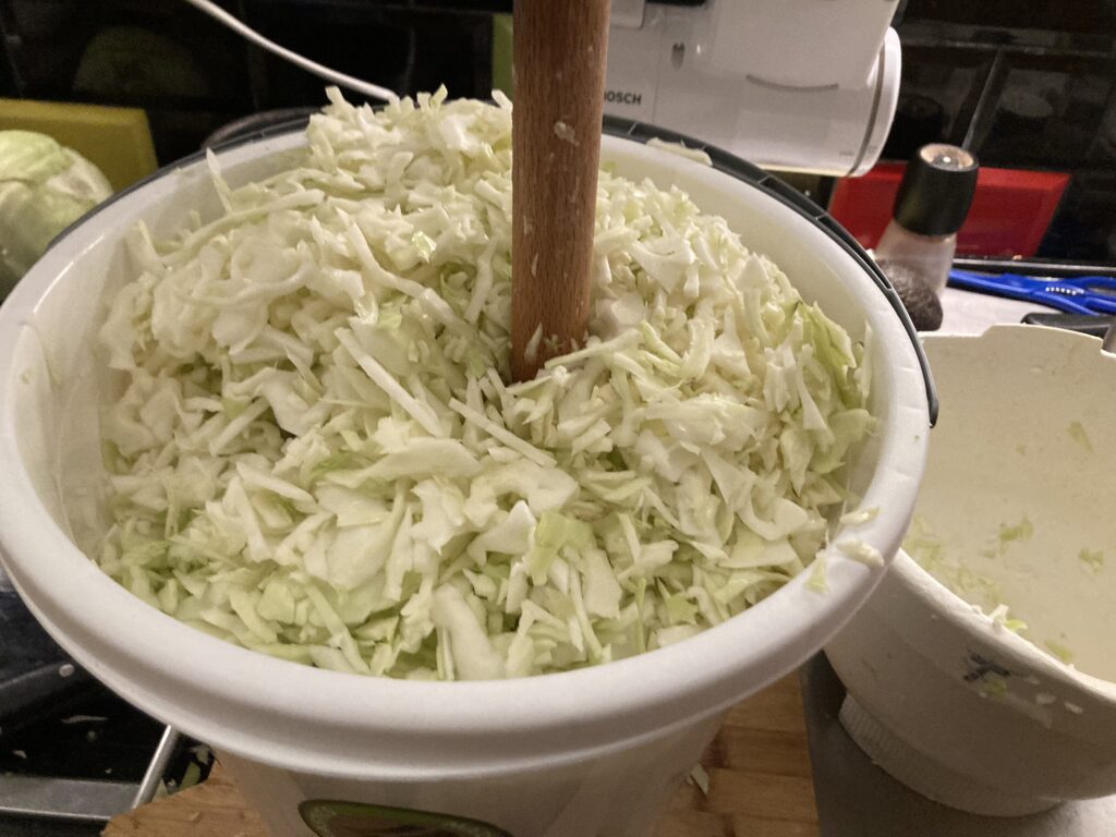 Ich habe schon mal Sauerkraut aus Chinakohl fermentiert. Das war sehr lecker, aber eigentlich erwartet man dann schon typischen Weißkohl, wenn es um Sauerkraut geht. Beim Bananen Fred gab es 10 Kilo Weißkohl für 5 Euro, damit waren wir schon im Geschäft. Aus sechs Kilo Weißkohl habe ich Sauerkraut gemacht, weil das in einen 10 Liter Eimer passte. Wenn ich davon nicht etwas für liebe Menschen aus meinem Umfeld abgeben würde, könnte ich mit sechs Kilo Sauerkraut über das Jahr kommen. Egal wie, schmeckt Sauerkraut selbst gemacht viel besser, als wenn man es verpackt kauft und es ist so einfach, dass es echt jeder kann. Schaut mal zu und entscheidet selbst. Zu Eurer Ehrenrettung, ich habe das auch lange gescheut, weil ich in Berlin keinen Platz und einen schimmeligen Keller hatte. Jetzt mit eigenem Haus habe ich Platz und kann das ohne Probleme machen.