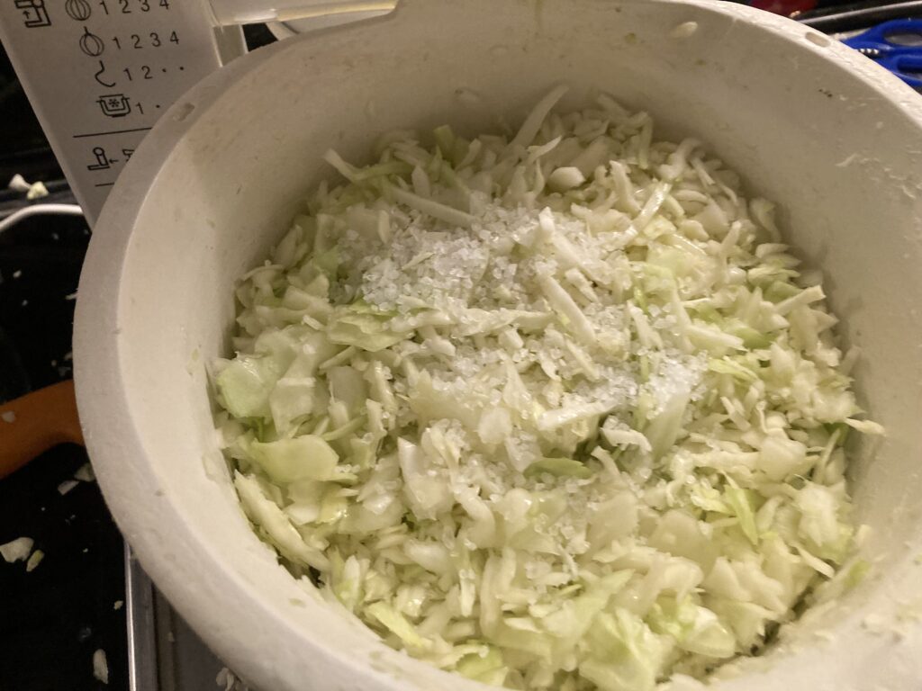 Weil ich nicht von Hand gehobelt habe, habe ich den Weißkohl so klein geschnitten, dass er in den Durchlaufschnitzler meiner Bosch Mum 4 passt.