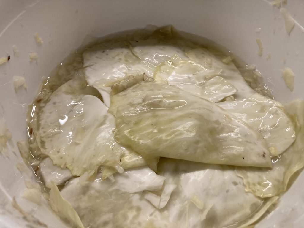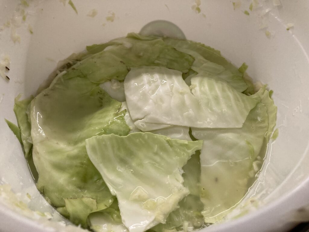 Mit großen Kohlblättern bedecken und den Kohl so fest andrücken, dass der Wasserspiegel über dem Kohl steht. Das ist ein einfaches Prinzip. Es soll keine Luft an den Kohl kommen, der dann schimmeln könnte, sondern die Flüssigkeit soll den Kohl nach oben luftdicht abschließen und zusammen mit dem Salzgehalt dafür sorgen, dass aus Weißkohl Sauerkraut wird.