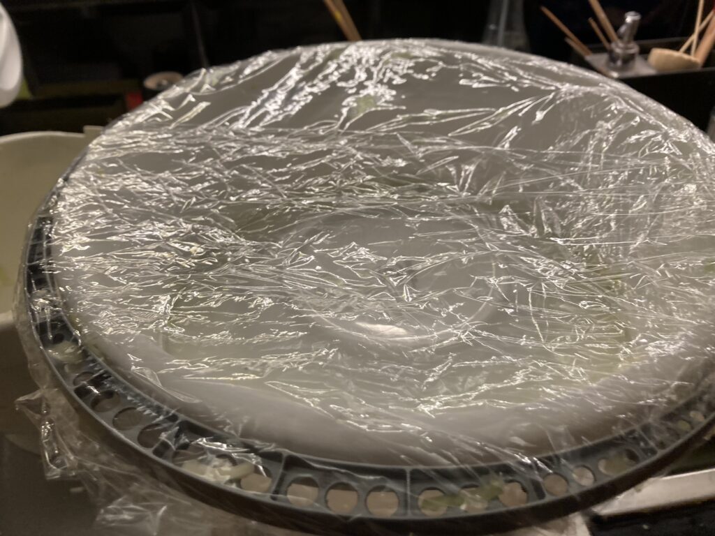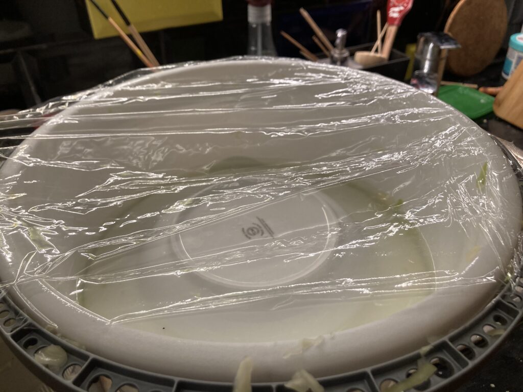 Oben mit einer Folie oder einem noch größeren Teller abdecken, der größer ist als der Eimer