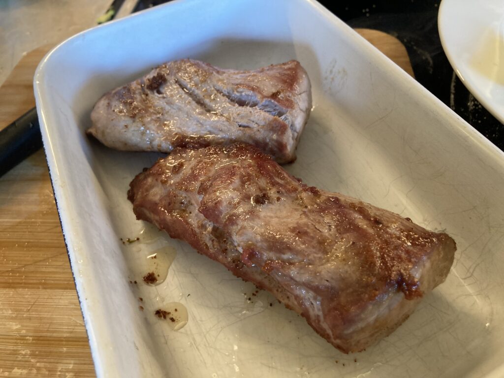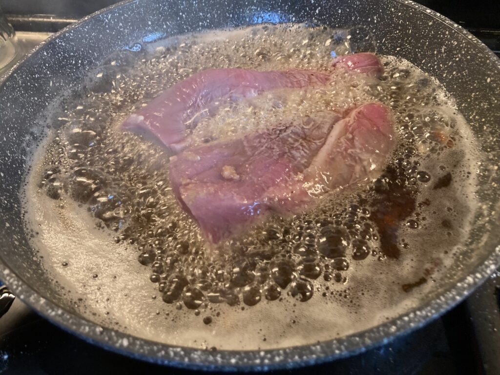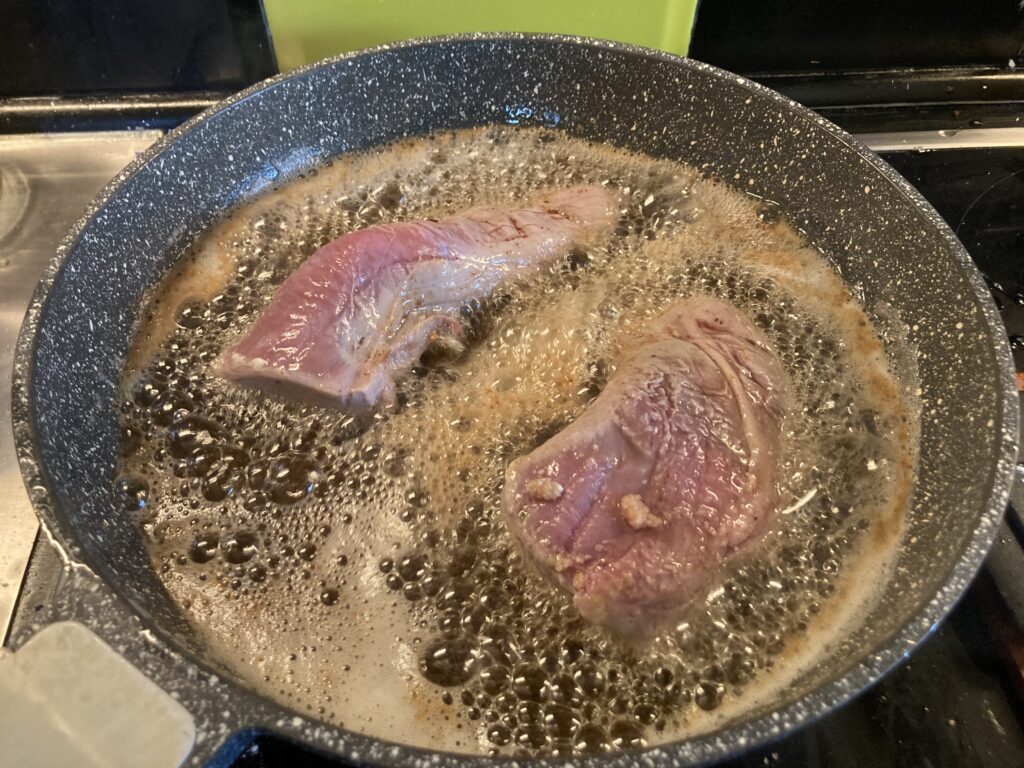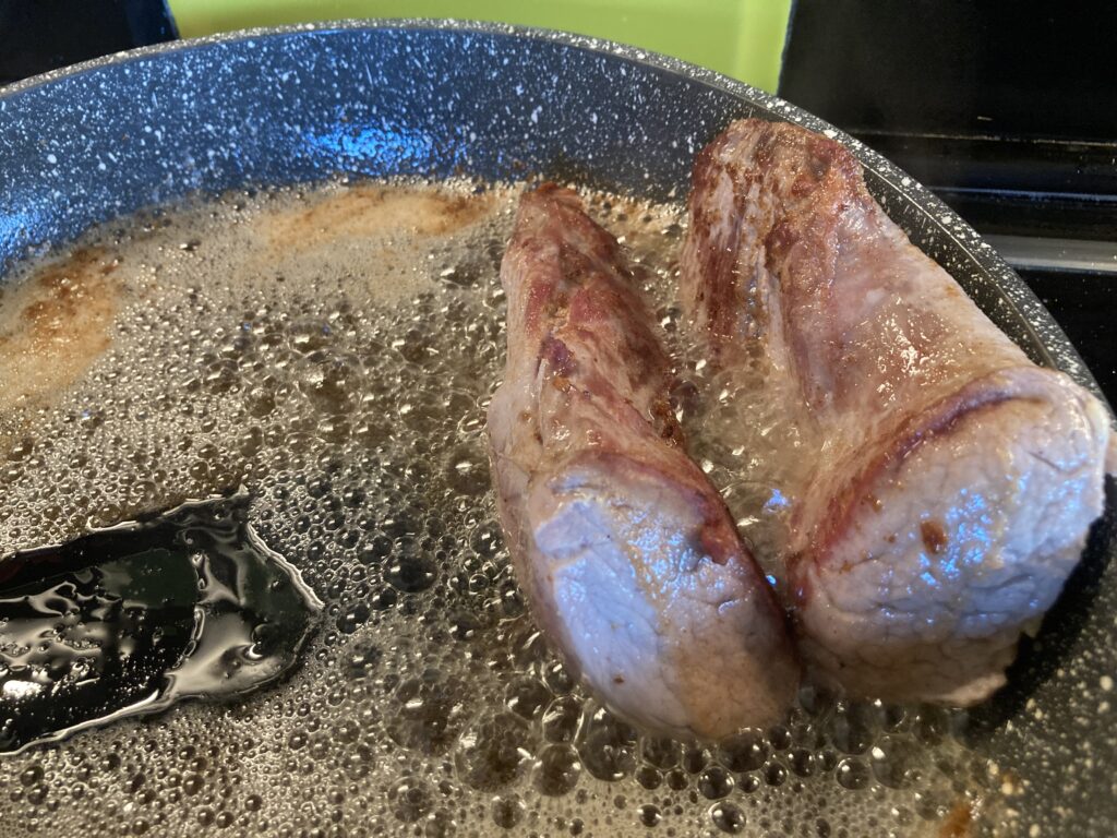 Nach zwei Minuten wenden, oder wenn Euch die Farbe gefällt, das ist je nach Herd und Pfanne unterschiedlich. Dann im gleichen Takter weiter wenden und nach 6 bis 9 Minuten (bei mir nach 6 Minuten) das Fleisch aus der Pfanne holen.