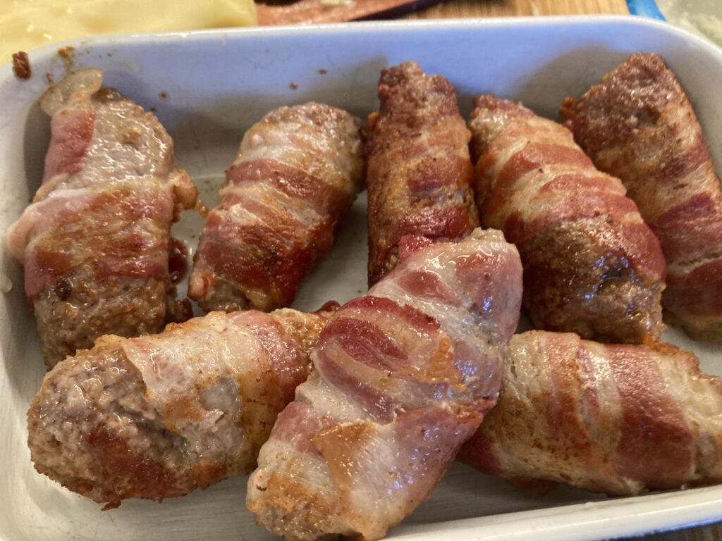 Hackfleischrollen umwickelt. Das offene Ende mache ich immer nach unten, dann verschließt es sich beim Anbraten in der Pfanne.