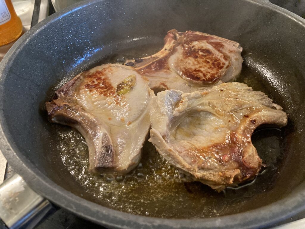 Ich brate in zwei Pfannen, weil es 12 Koteletts sind. Bei der Größe sind das auch vier Pfannenladungen. Falls Ihr einen Grill habt, könntet Ihr das Fleisch natürlich auch grillen.