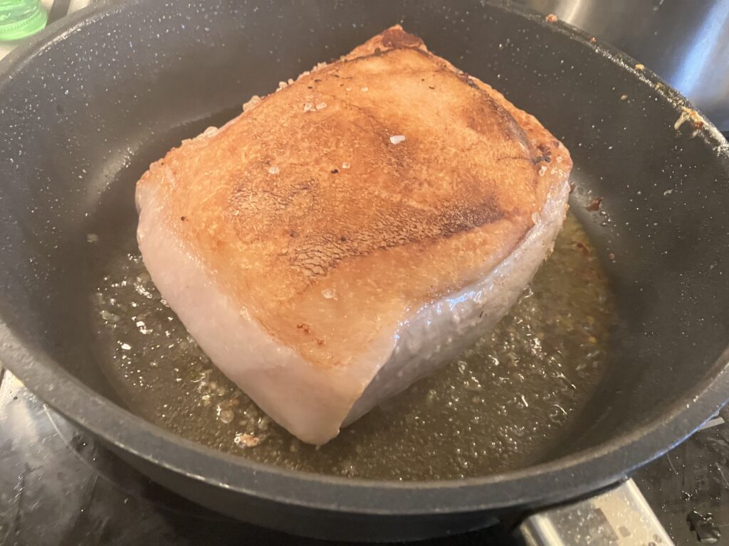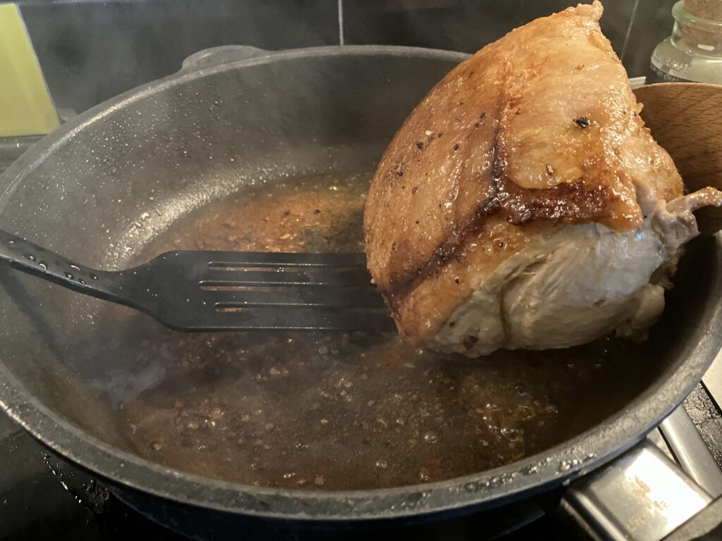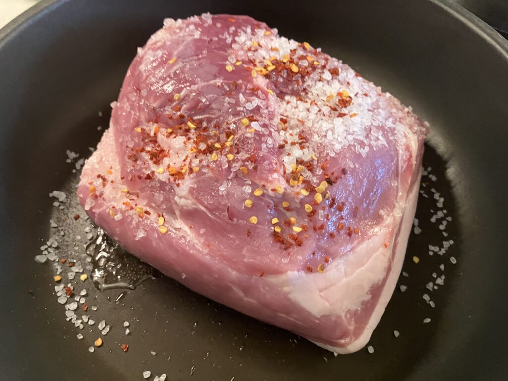 Pfanne trocken erhitzen. Ich lege das Fleisch auf die Fettseite und brate es an bei Vollgas.
