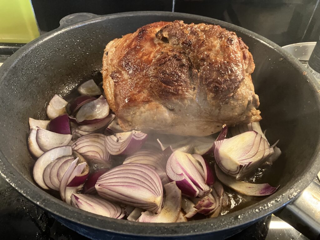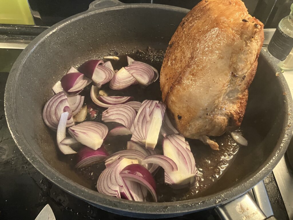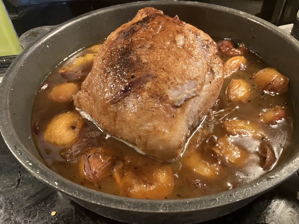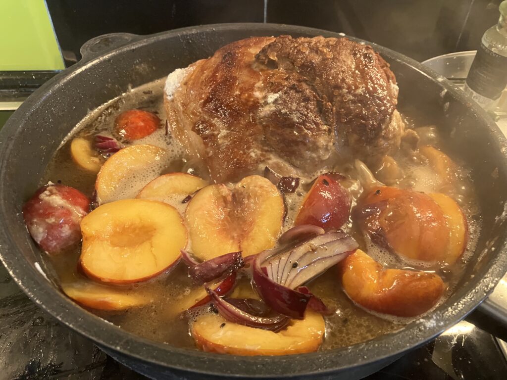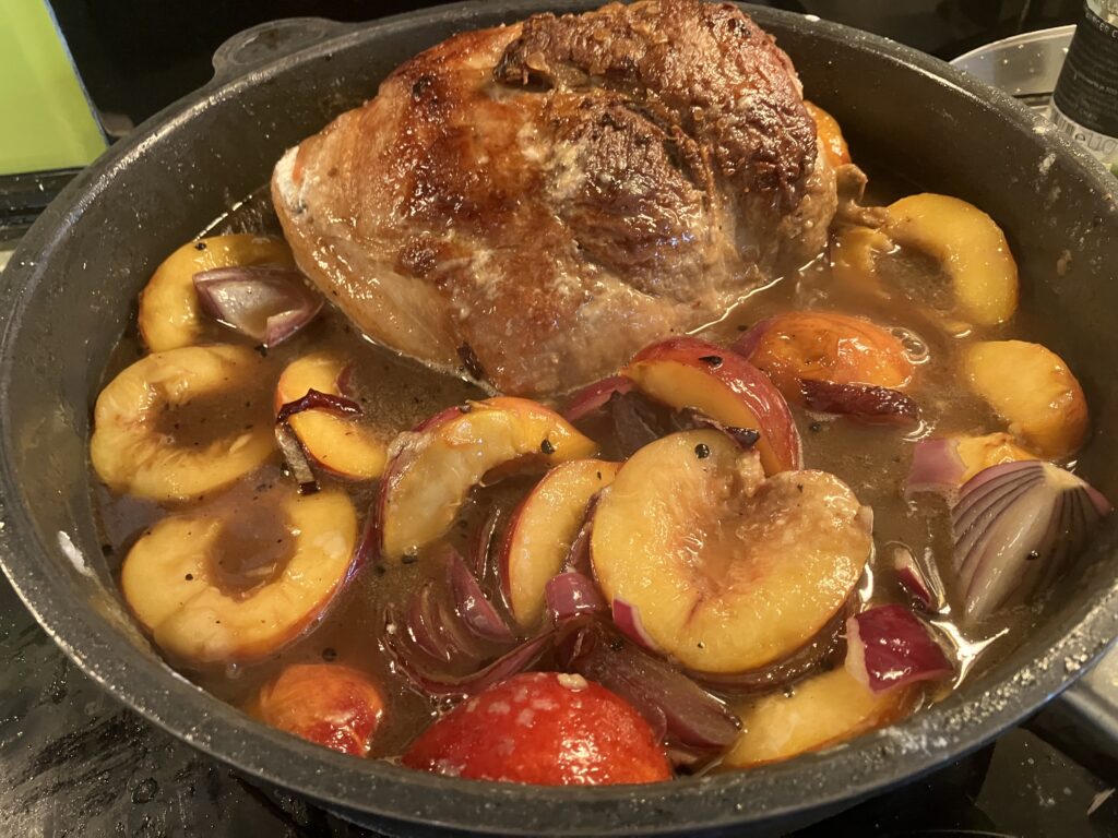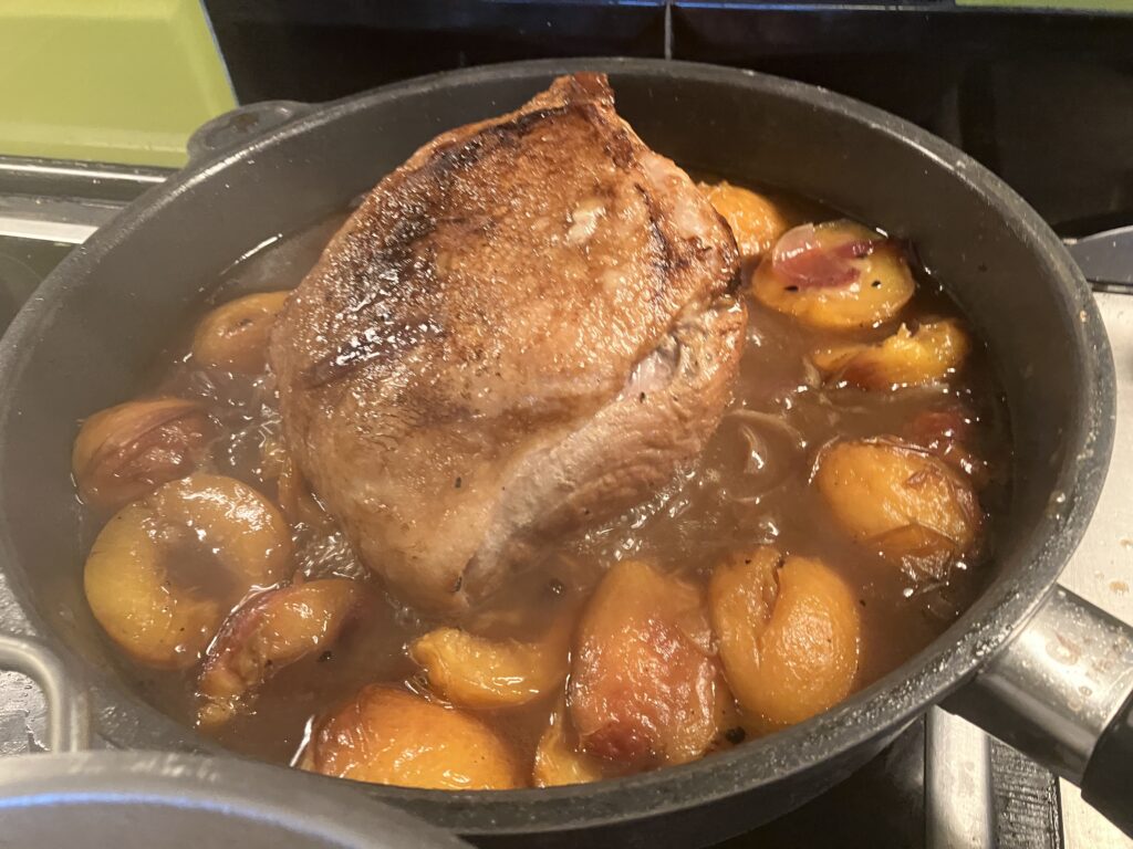 Fleisch wieder zur Soße und den Nektarinen in die Pfanne geben, damit es nicht auskühlt. Herd ist so eingestellt, dass es nur noch warmgehalten wird, aber nicht nachgart. (Stufe 1 der 2).