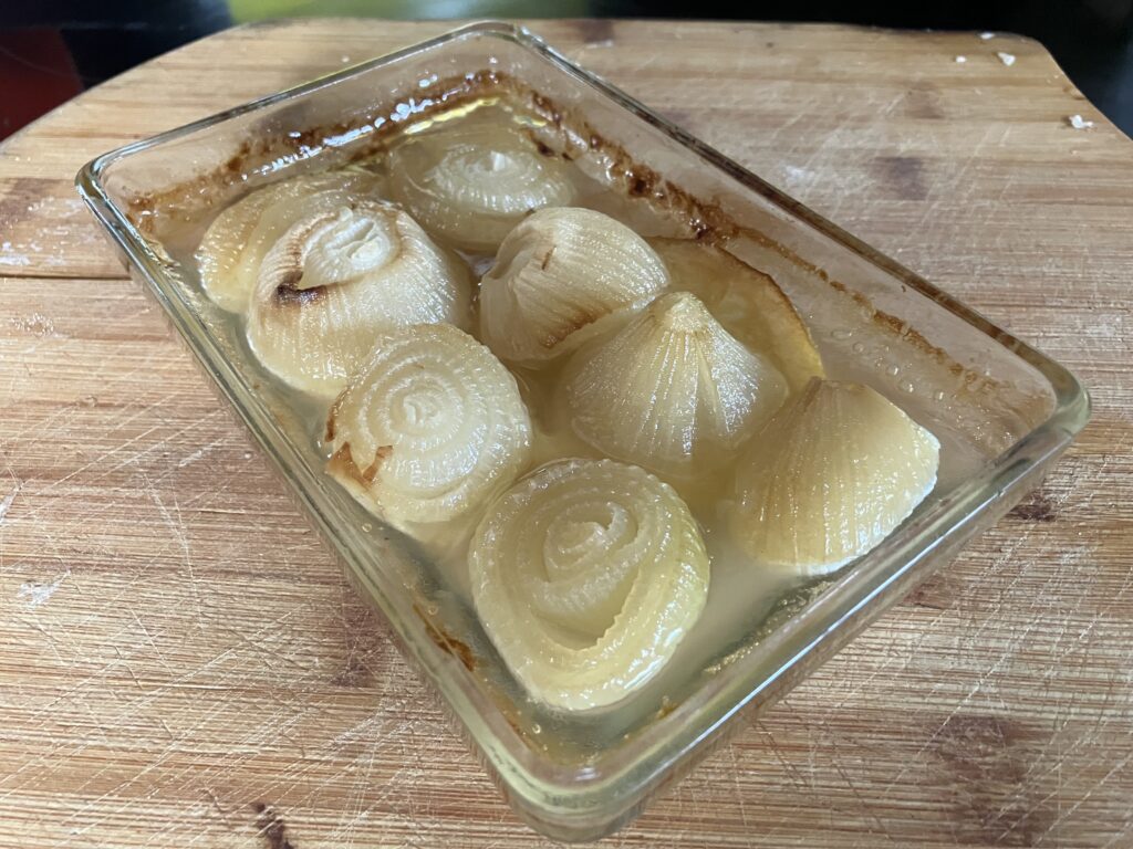 Gemeinsam mit allen anderen Gemüsen, verbringen die Zwiebeln eine dreiviertel Stunde im Ofen.