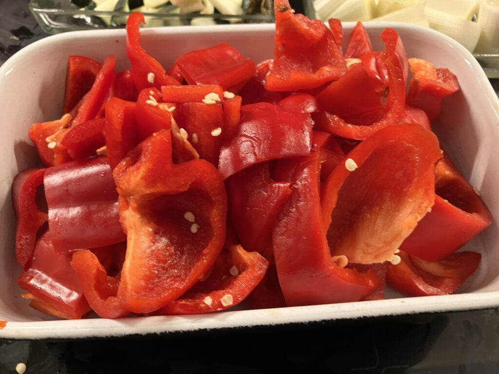 Paprika zerkleinern und in eine Ofenform legen