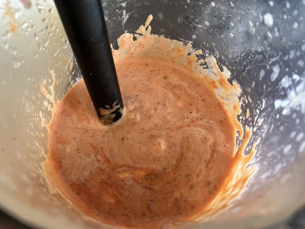 Im Mixbecher wird es mit einem Pürierstab, oder wie bei mir mit dem ESGE Zauberstab zerkleinert.
