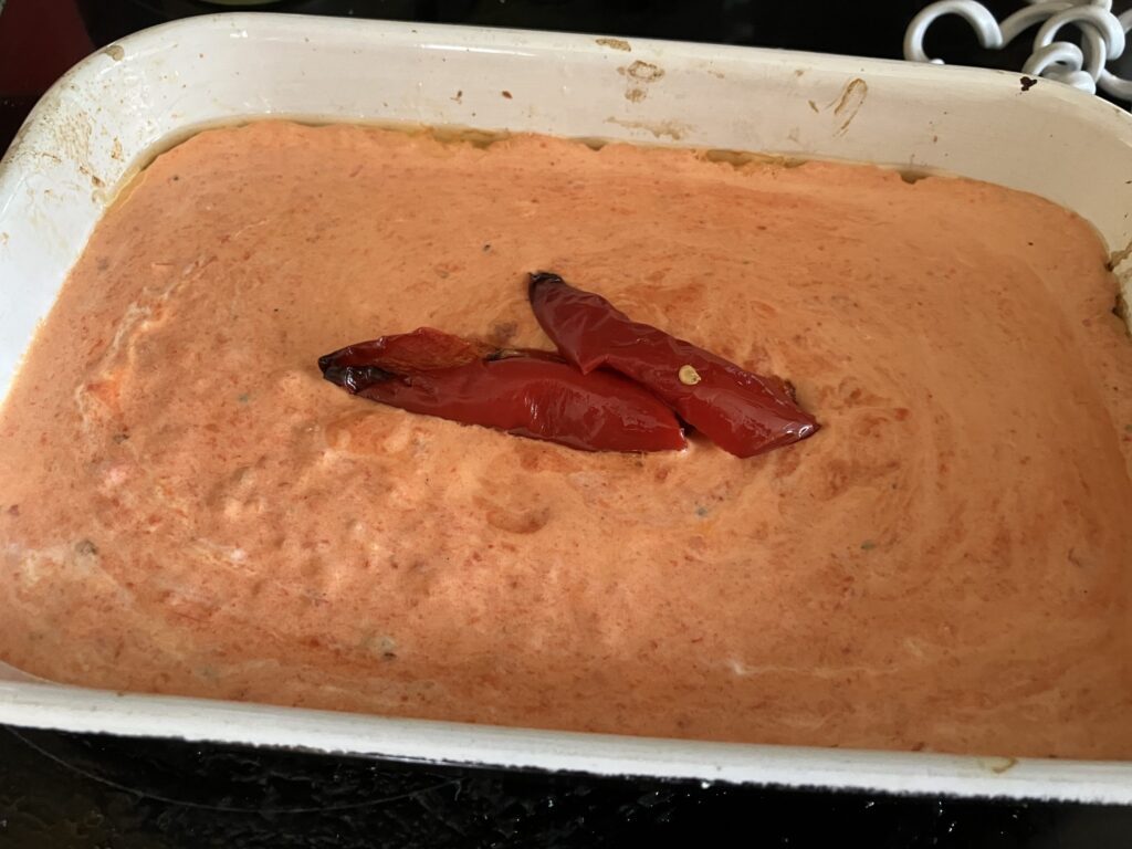 Der Paprikadipp ist schön würzig, hat eine natürliche Süße und ist gleichzeitig auch ein bisschen herb. Salz und Pfeffer passen gut und der Joghurt, sowieso die Zitrone geben eine angenehme Säure. Mit dem Fladenbrot zusammen ist es zumindest ein guter Einstieg ins Essen, manche Leute essen sich auf daran satt. Ich hatte noch Fleisch, Kartoffeln, Nudeln, und verschieden Soße, damit sich jeder nach seinen Wünschen ernähren konnte.