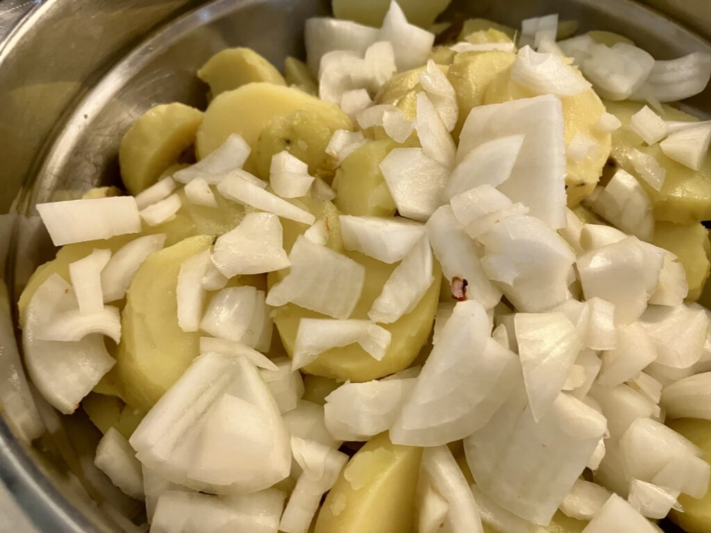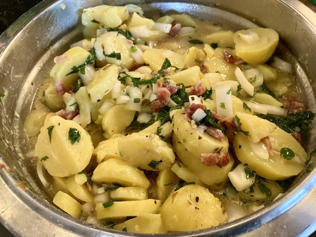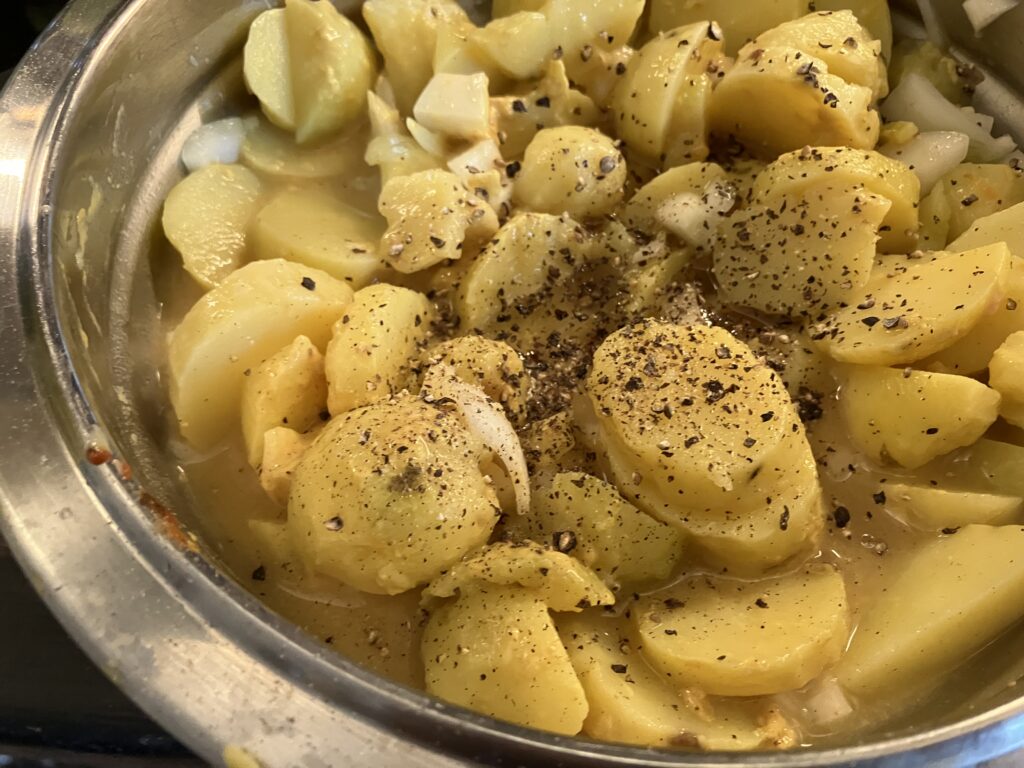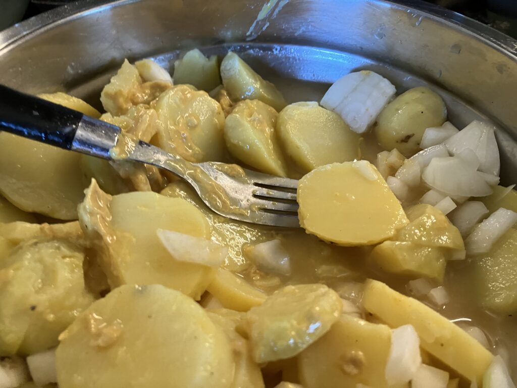 Die gestern abgekochten Kartoffeln wurden heute Morgen zubereitet, damit sie mehrere Stunden ziehen konnten. Lediglich die Zwiebeln blanchierte ich zwei Minuten in der Brühe, weil rohe Zwiebeln über Nacht einen Eigengeschmack entwickeln, den ich nicht mag.