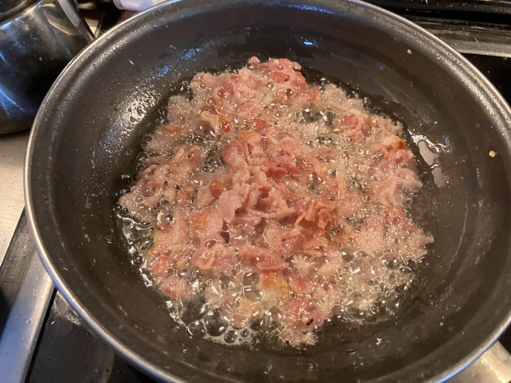 Bacon mit Rapsöl in der Pfanne auslassen. Mit Vollgas anfangen und dann die Hitze in dem Maße reduzieren, wie der Speckt sichtbar wegbrät und sich verflüssigt