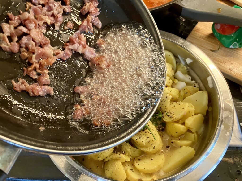 Einmal umrühren und ab an den Tisch. Ich mag den Kartoffelsalat sehr, weil er auf den Punkt ist. Knackige Zwiebeln, leckerer Bacon, ein kräftiges Dressing mit viel Bratensaft als Geschmacksträger und Senf.