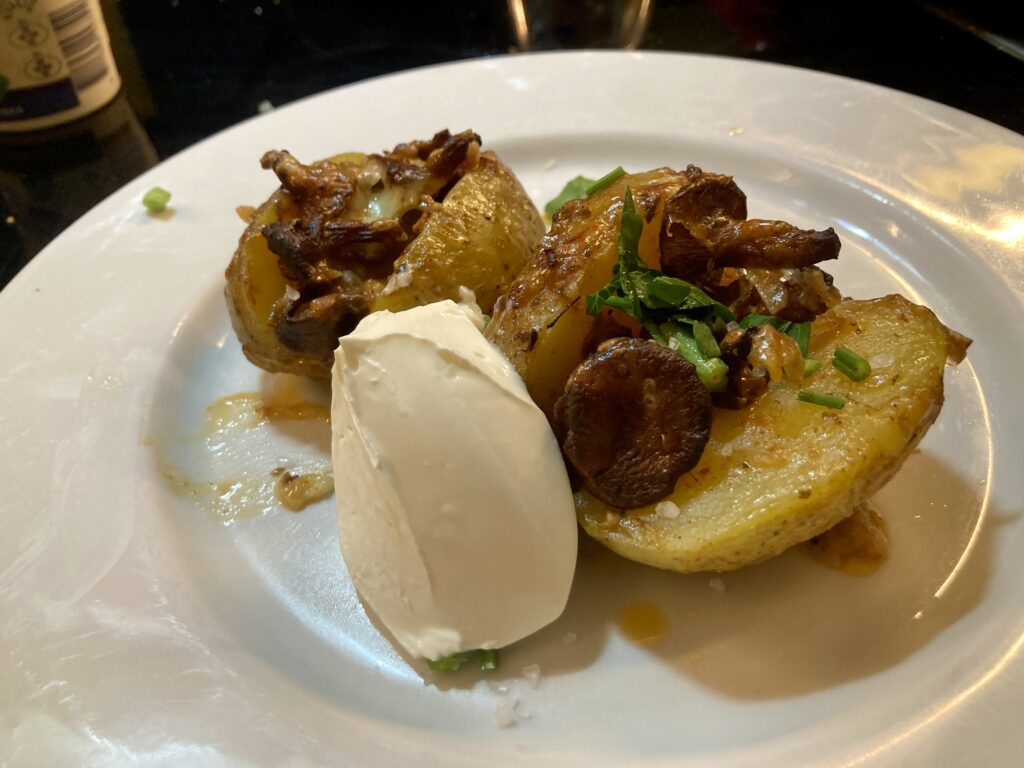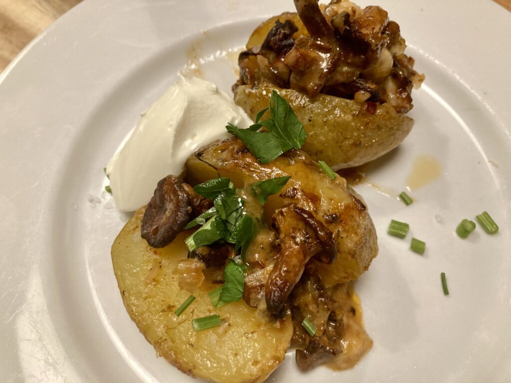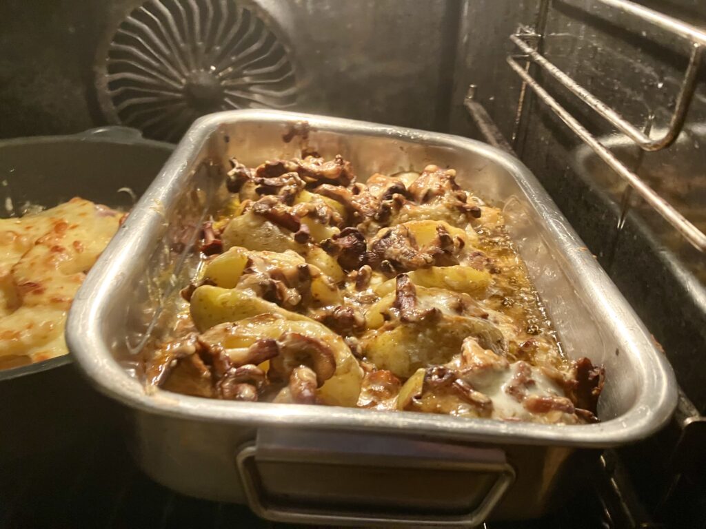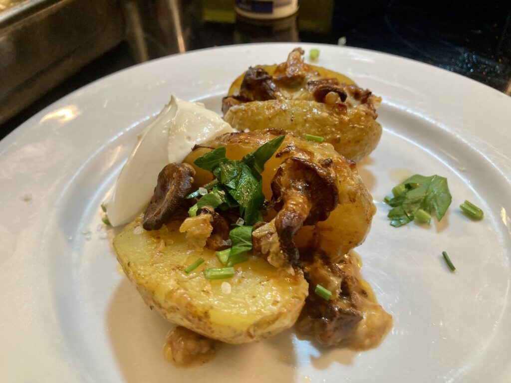Die Kartoffeln mit überbackenen Pfifferlingen begleite ich einfach nur mit purer Creme fraiche. Das haut voll hin und ist echter Genuß.