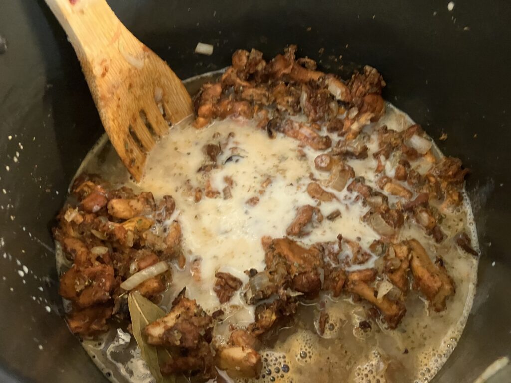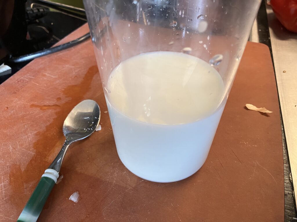 Ich habe mich für ordinäre Milch entschieden. Die restlichen Zutaten binden mit dem Mehl ab und das wird schön sämig und die Kalorien kann man sich sparen