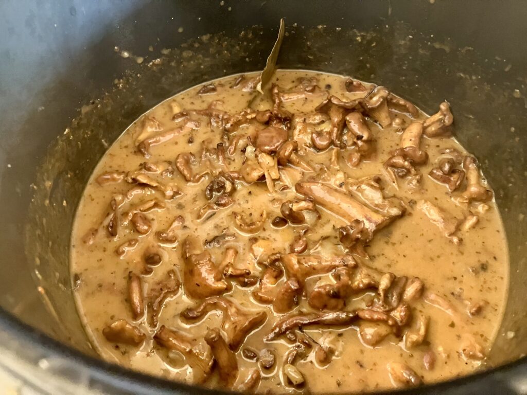 Pfifferlinge und Wacholderbeeren und Lorbeerblätter in den Topf geben