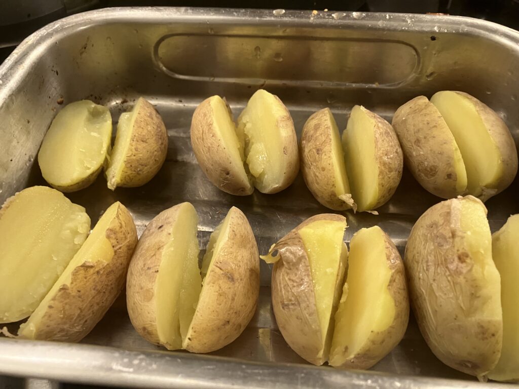 Kartoffeln halbieren, aber möglichst nicht ganz durchschneiden
