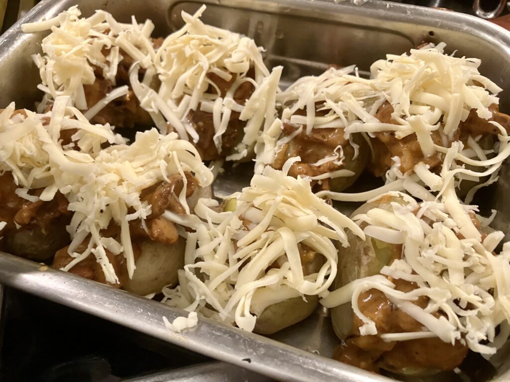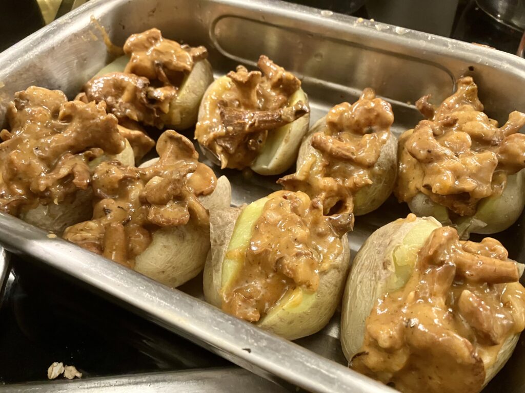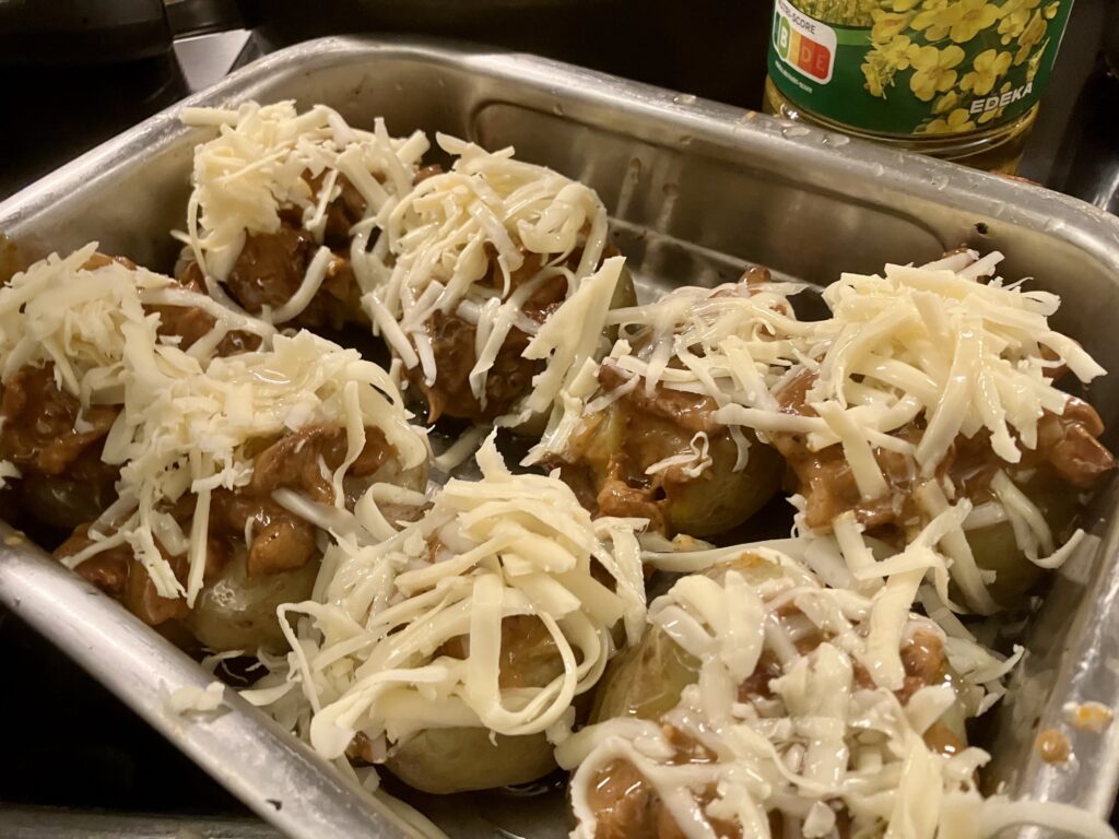 Pfifferlinge kalt aus dem Topf nehmen und in die Kartoffeln füllen. Dafür benutze ich einen Esslöffel