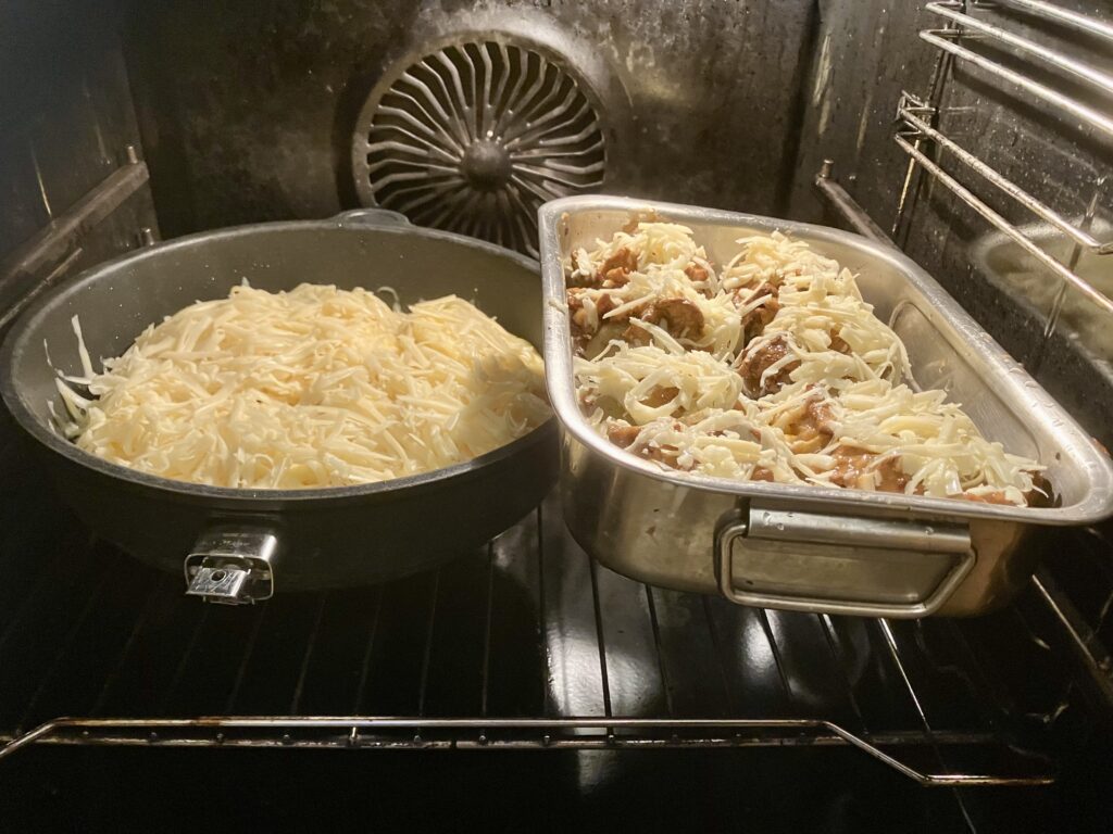 Noch ein bisschen Rapsöl in die Form gießen, damit die Kartoffeln knuspriger werden. Backzeit bei 200 Grad Umluft, 25 bis 30 Minuten