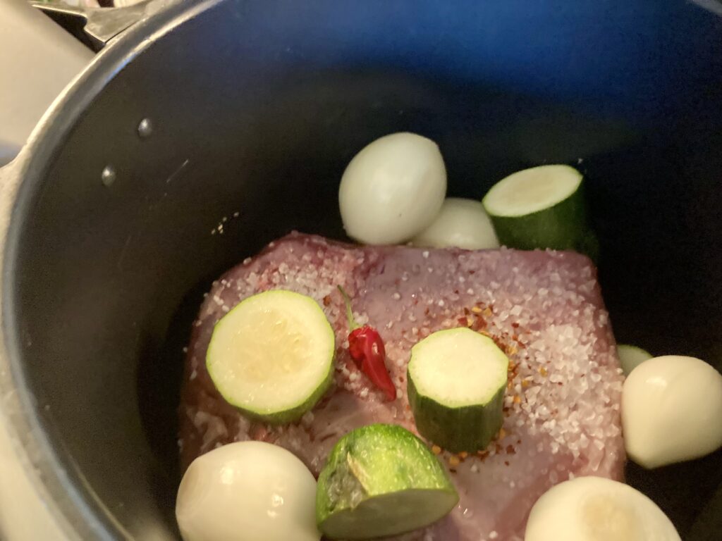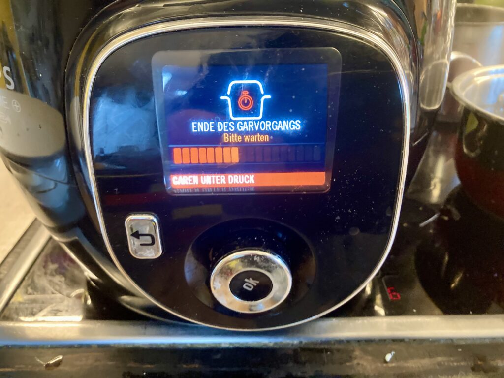 Meinen Druckkochtopf schließen, Zeit auf 20 Minuten einstellen und alle Zutaten miteinander garen. In der Zeit machen wir die anderen Beilagen. Die Kartoffeln könnten schon paralel garen, Kräuterquark anrühren, Salat machen.