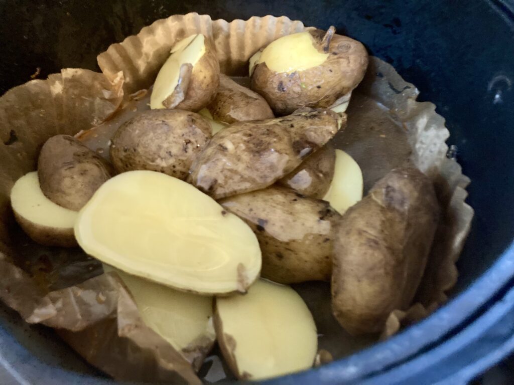 Kartoffeln halbieren und für 35 Minuten in die Heißluftfritteuse bei 200 Grad geben