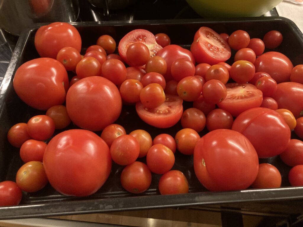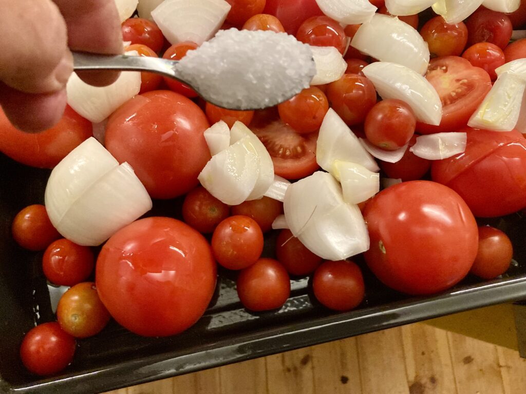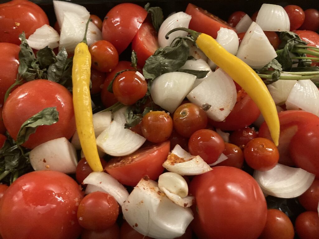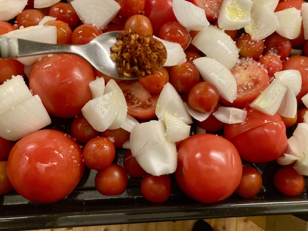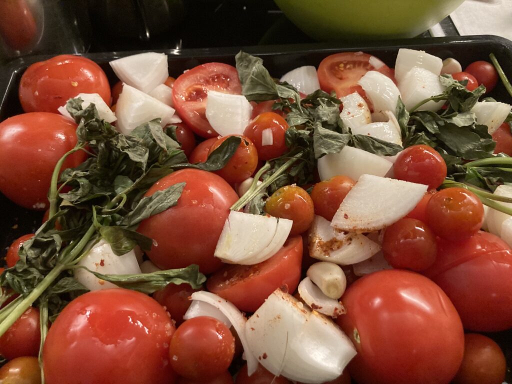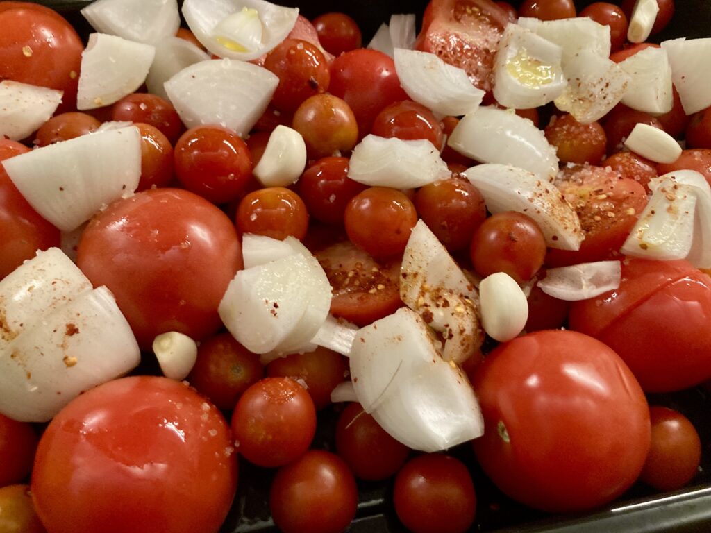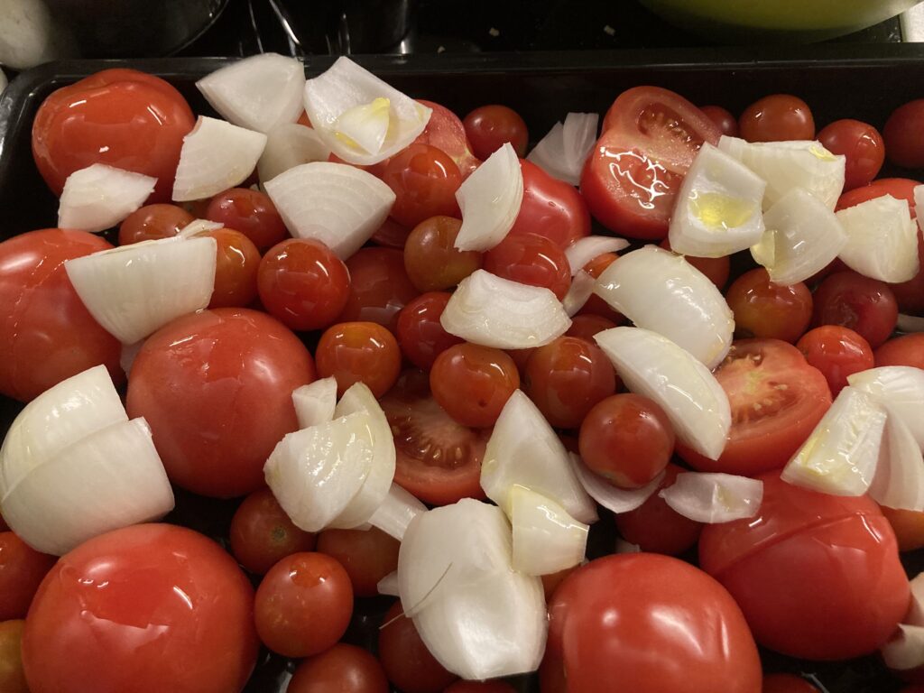 Wenn man keine Zeit und keine Lust zu kochen hat, ist das der maximale Ertrag den man erzielen kann. Einfach die Tomaten auf ein Blech werfen, die großen Tomaten vielleicht noch halbieren, Zwiebeln, Knoblauch und Kräuter nach Wünsch, ein bisschen Öl, damit es gut durch den Hals geht und den Rest macht der Ofen. Ein Schlag ins Gesicht der Dosen- und Tütensoßenmafia und für die ganzen Faulpelz*Innen mit den immer gleichen Ausreden, wieso es jetzt gerade wieder Convenience und Bringdienst sein mussten.