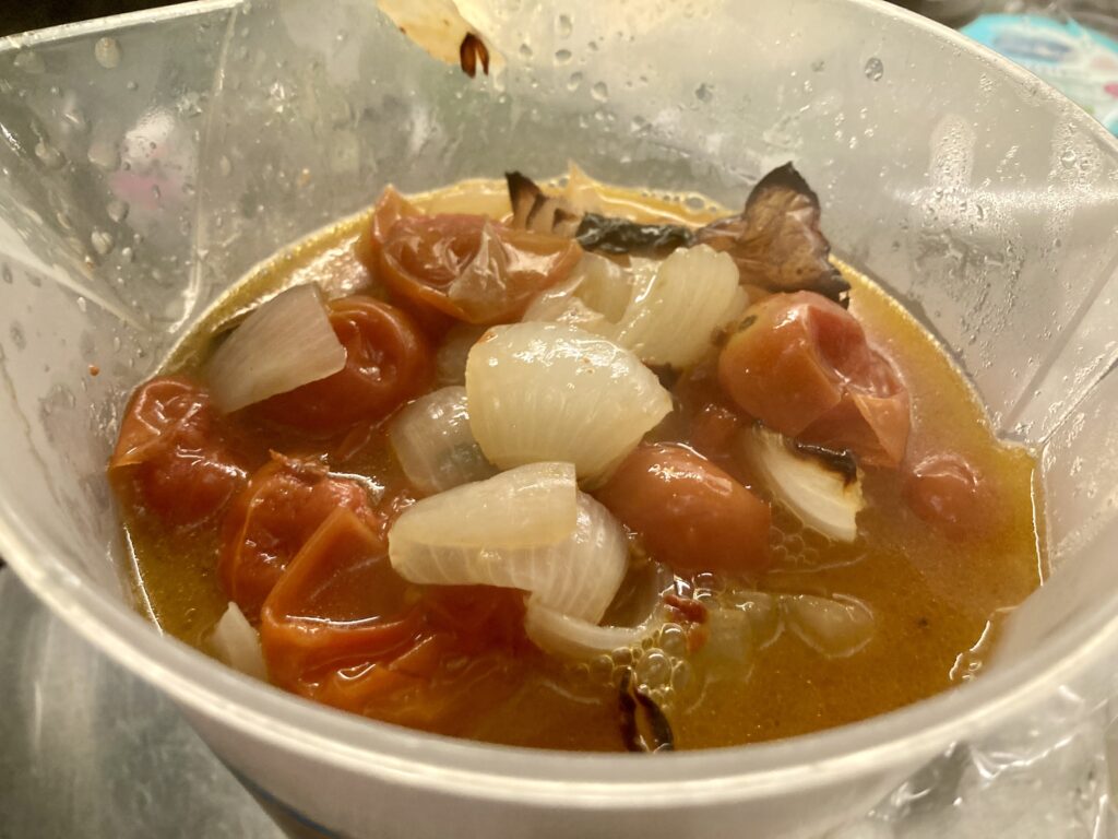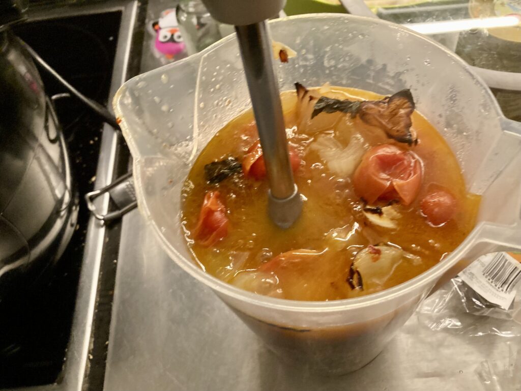 Ich hatte noch ein paar getrocknete Tomaten und Backpflaumen übrig, wässerte sie in heißem Wasser und fügte sie mit der Masse hinzu, dann wurde püriert.