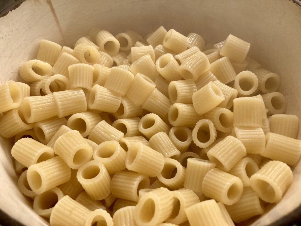Geschredderte Nudelsoße in einen Topf umfüllen, damit man sie warmhalten, oder wieder erwärmen kann.