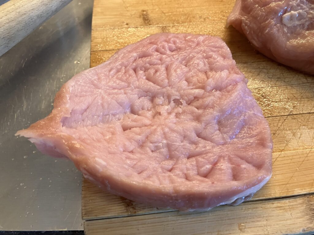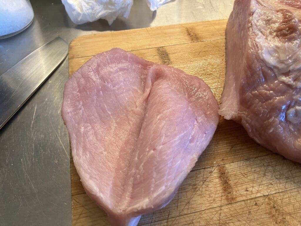 Hier ist durchgeschnitten auf aufgeklappt. Weil das Fleisch gefüllt wird, brauchen wir mehr Fläche. Durch den symmetrischen Aufschnitt, ist es einfacher, das hinterher wieder deckungsgleich zusammenzuklappen. Fleisch dünner klopfen mit dem Fleischklopfer, oder Ihr dafür sonst so nehmt.