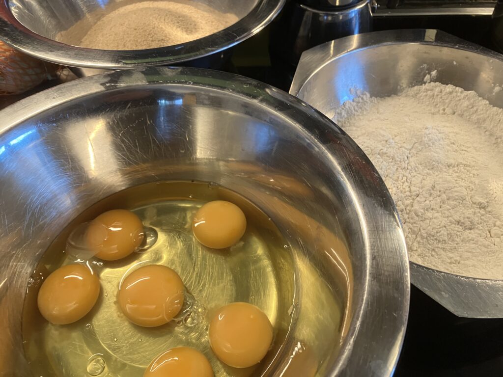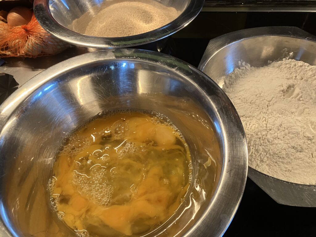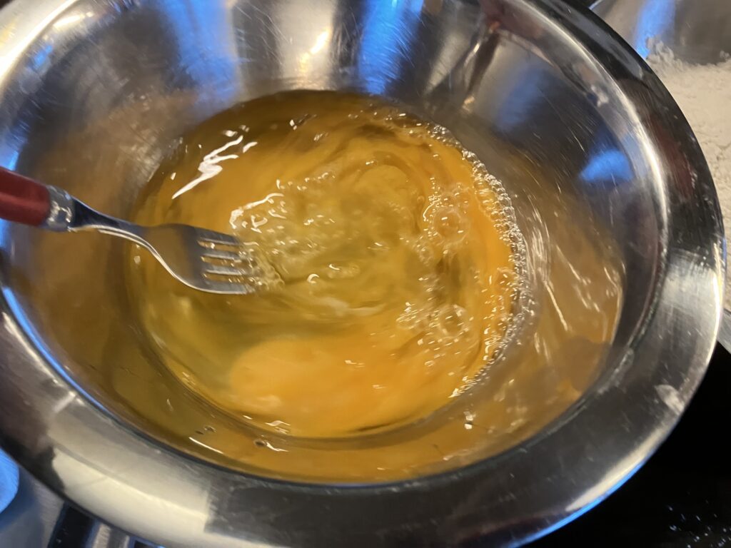 Das ist eine Panierstraße aus Mehl, Ei und Paniermehl