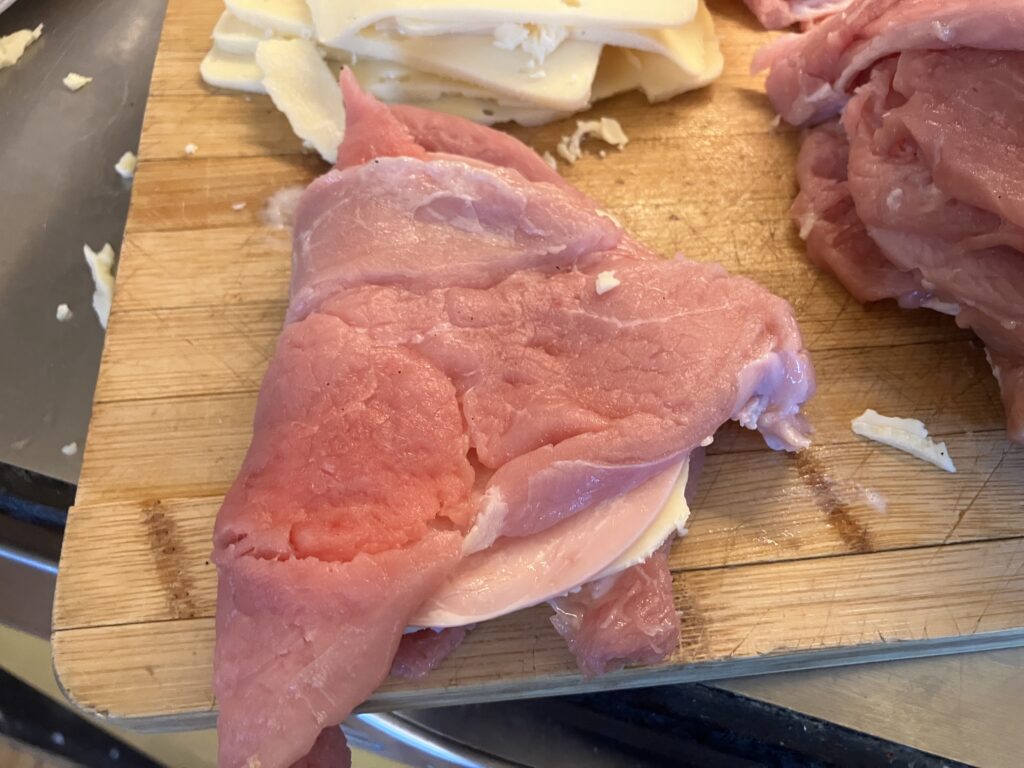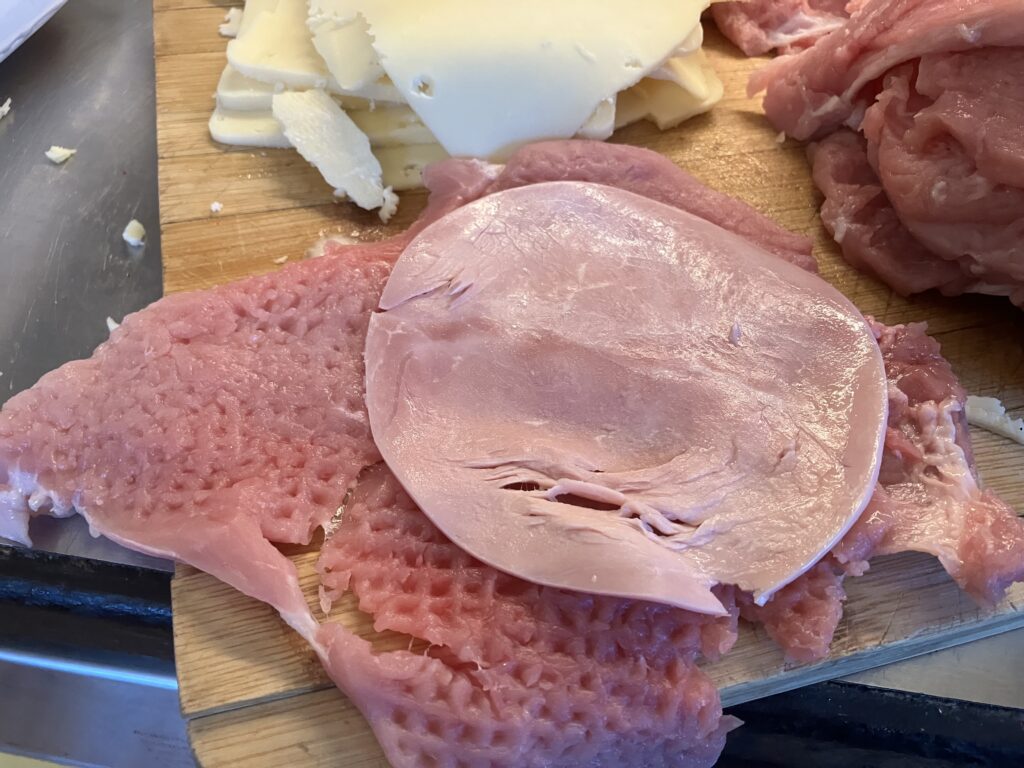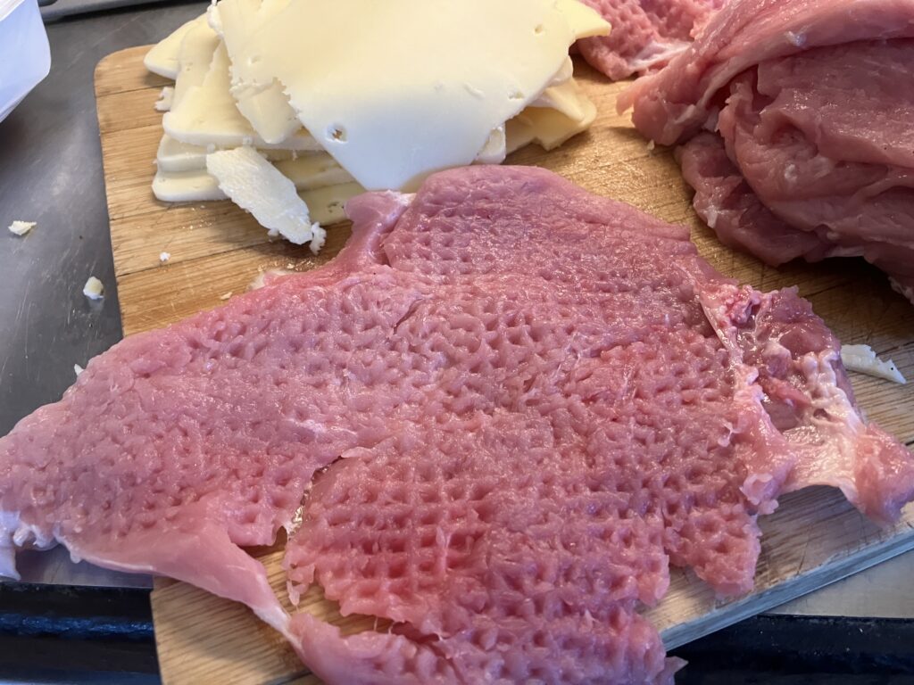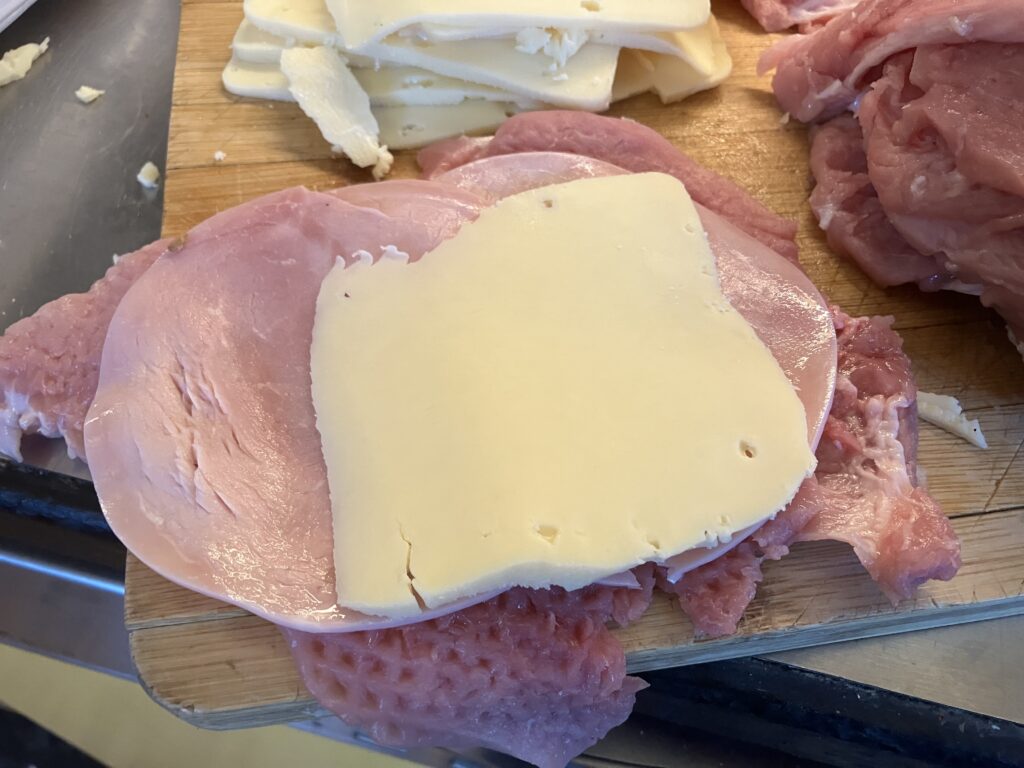 Ich hatte noch eine Oberschale vom Duke of Berkshire Schwein in der Kühlung. Das Fleisch kostet normal Kilopreis 23 Euro netto und ich kaufe das immer als MHD Ware wenn es 3, oder 4 Euro pro Kilo kostet im Gastrogroßhandel. Das ist eine ziemlich fette Schweinerasse, die besser gehalten wird als normale Hybridschweine. Das ist ganz tolles, zartes und saftiges Fleisch, das ich jedem nur empfehlen kann. Gibt es auch regulär bei Edeka zu kaufen. Wie die meisten Schnitzel die einen gewissen Berühmtheitsgrad haben, wird für ein Cordon bleu normalerweise Kalbsfleisch genommen. Wenn man den Normalpreis für das Schwein zahlen würde, könnte man tatsächlich auch gleich Kalb nehmen, aber mal offen gesprochen es würde mir auch mit Huhn, oder Pute gut schmecken und ich nehme halt das was gerade da ist. Angesichts meiner Beilagenzusammenstellung stirbt garantiert ein Österreicher, aber die verwalten ja meistens Schätze an deren Entstehung sie nicht selbst beteiligt waren, mit Grüssen aus Mailand, Rom und dem Rest des Schnitzeluniversums