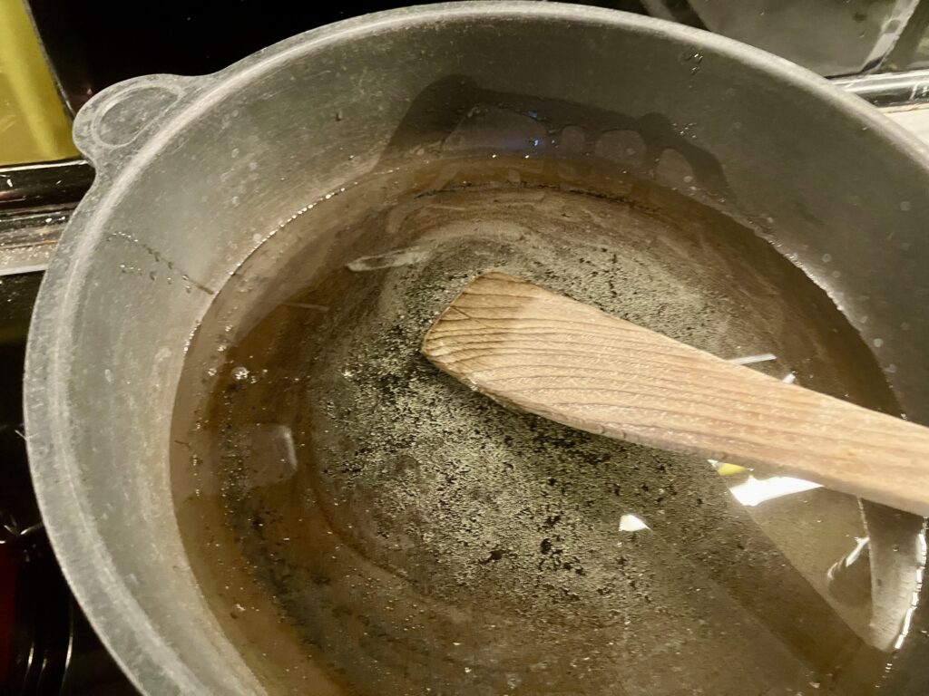 Öl erhitzen bis am Pfannenwender aus Holz die Blasen sprudeln