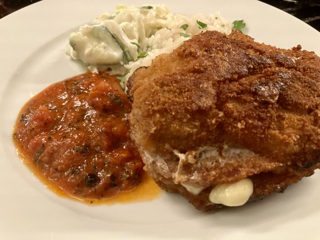 Knussprige Panierung, lecker mit dem gekochten Schinken und dem schmelzenden Käse als Füllung. Der Salat ist dazu frisch und die Tomatensoße sehr würzig und fruchtig.