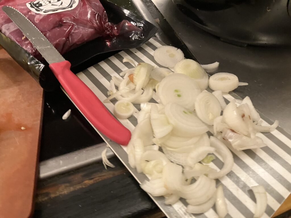 Zwiebeln schneiden für die gebratenen Kartoffelklöße