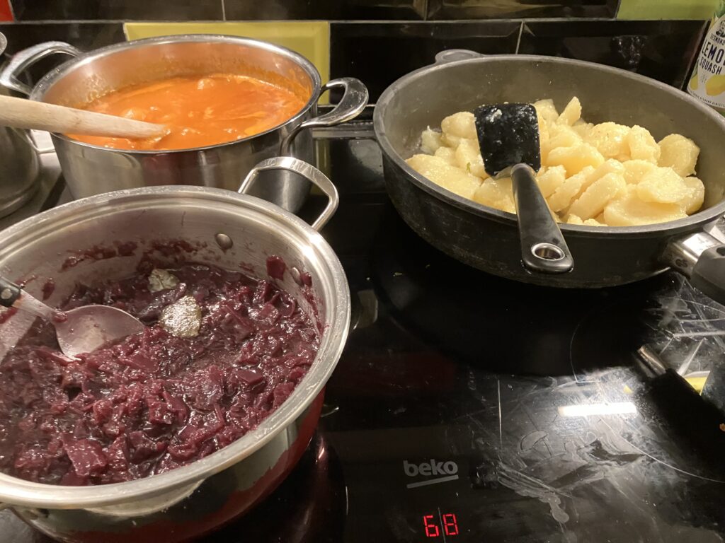 Rotkohl vom Vortag wärmt im Topf an. Hinten linke eine Tomatensoße, für die die immer nichts mögen.