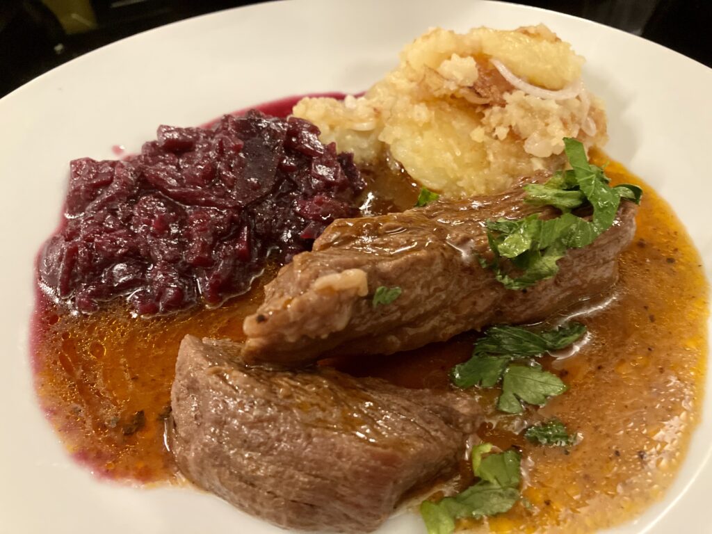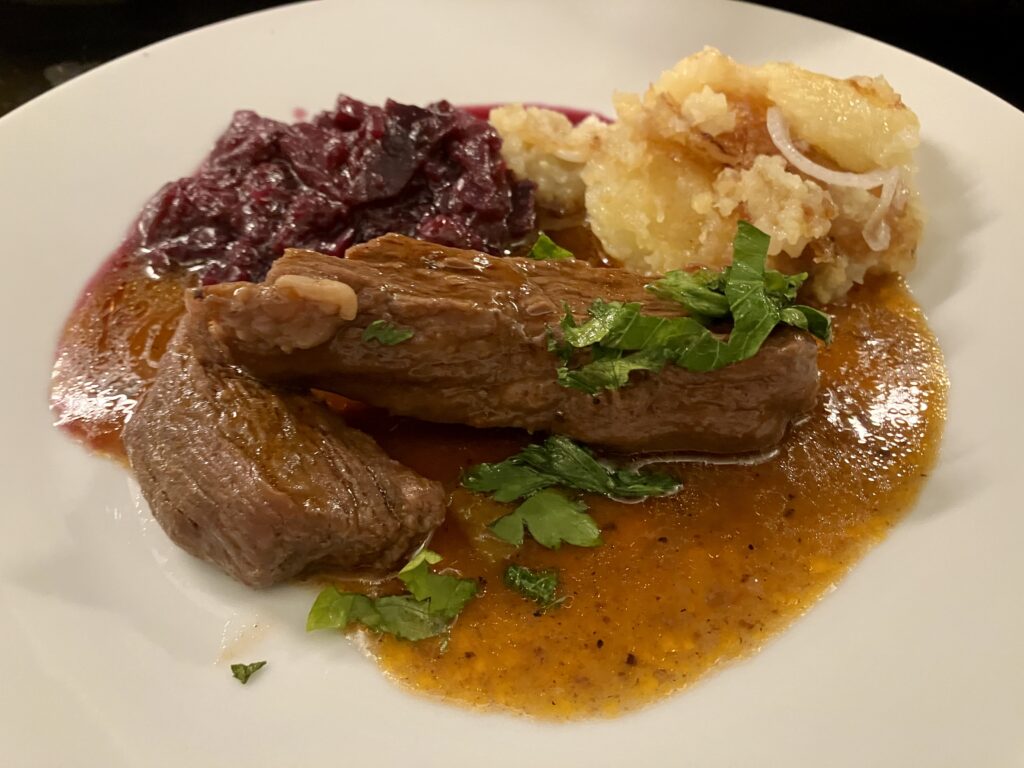 Ganz zartes Rinderfleisch, eine süffige Soße, Rotkraut zum Niederknien und tolle gebratene Kartoffelklöße. Wenn man auf so rustikales Essen steht, dann kommt danach nicht mehr viel. Es ist aber auch wirklich richtig gut.