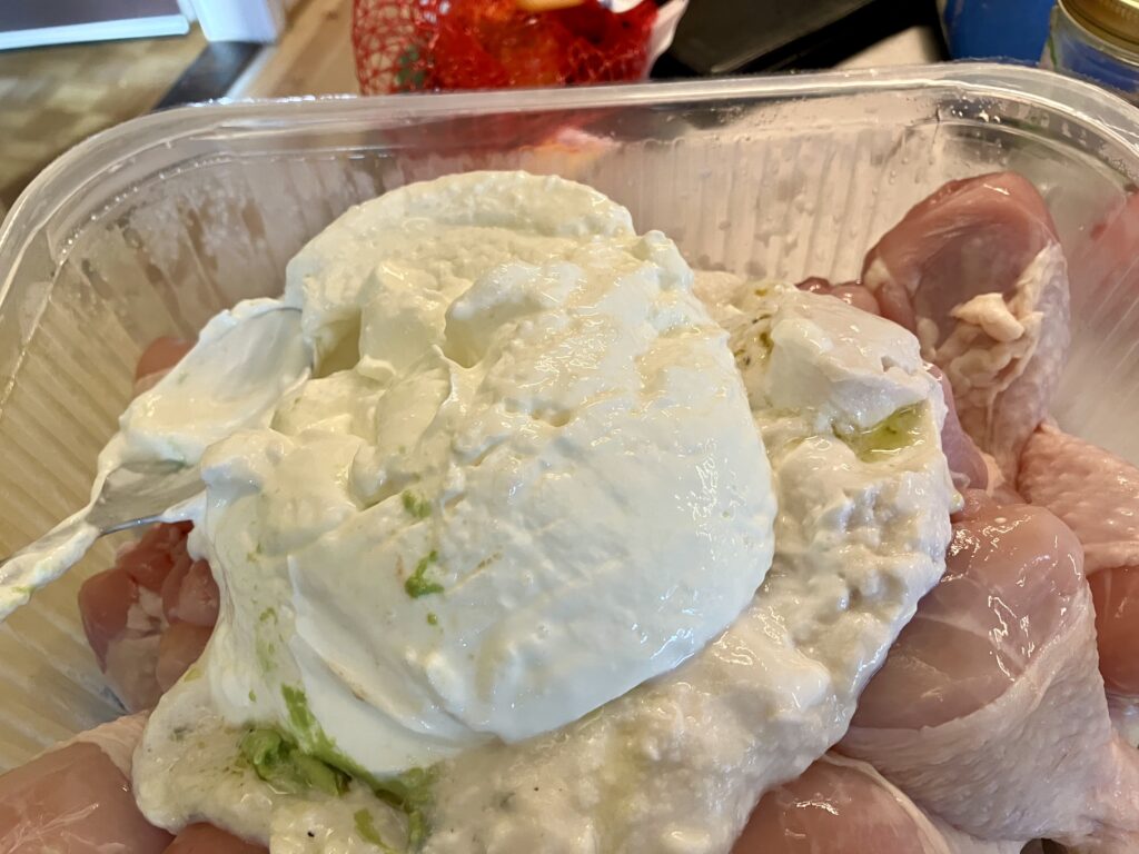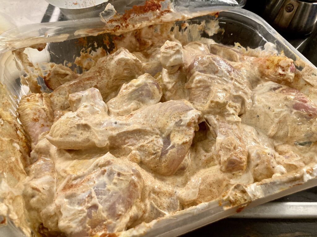 Die Hähnchenunterschenkel waren zu bekommen, also wurde es Hähnchenbrust. Das hat sich als besser erwiesen, weil mein Mann nicht gerne mit den Fingern ißt. Sie wurden groß geschnitten und zogen 6 Stunden in der Joghurtmarinade.