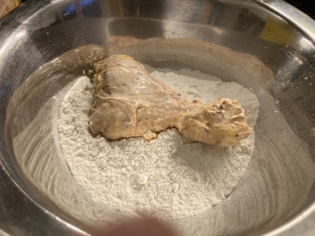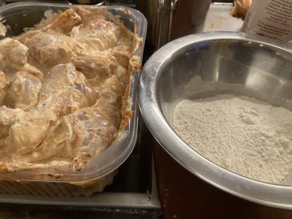 Mein erster Weg führt mich morgens immer zum Handelshof und dann schaue ich, was die gerne loswerden möchten. Dieses Mal waren es um die drei Kilo Unterkeulen vom Huhn für drei Euro pro Kilo. Mein Kühlschrank sagte mir, dass die vegane Joghurtalternative mit Soja auch mal weg könnte und weil ich kein Dogmatiker bin, habe ich noch einen Rest 3,5 % Joghurt dazugekippt. Das Einlegen vom Huhn in Joghurt kennt man sowohl in den Südstaaten der USA und auch in Asien. Das Huhn bekommt dadurch noch mehr Geschmack, wird noch zarter und Umhüllungen wie Paniermehl, oder einfaches Mehl halten dann besser am Huhn und machen eine schöne Kruste. Genau das wollte ich haben!