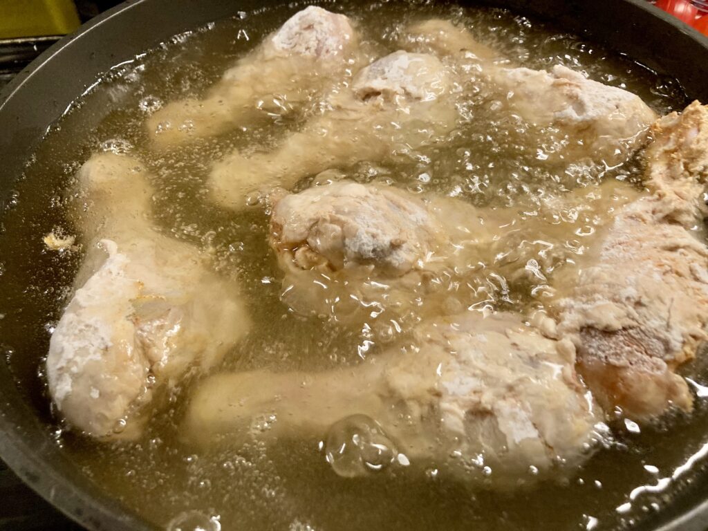 Das Huhn muß im Öl gewendet werden und soll leicht braun werden, aber noch Platz zum Nachbräunen haben, weil es einen zweiten Durchgang im Öl gibt