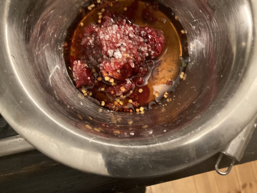 Man kann das Fleisch im Kühlschrank übernachten lassen, oder nur ein paar Stunden, oder wenn es gar nicht anders geht von jetzt auf gleich weiterverarbeiten. Bei mir waren es die Stunden vom Vormittag bei zum Abendessen, die es Zeit zum Durchziehen hatte.