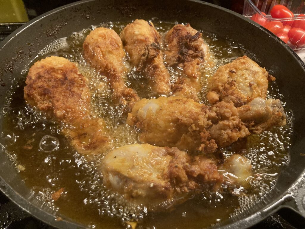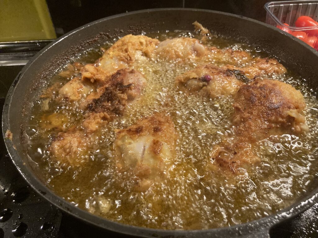 Wenn die Pommes den ersten Durchgang im Öl hinter sich haben, bekommen die Hähnenteile ihren weiten Durchgang, bei dem sie schön braunwerden sollen und knusprig von außen
