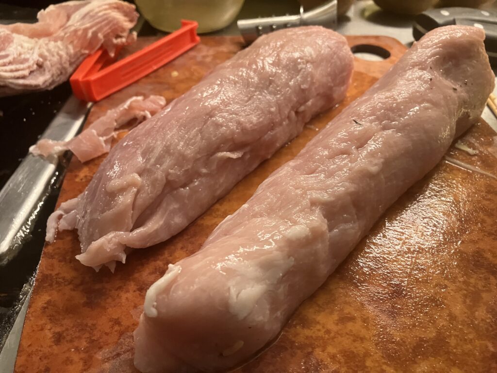 Ich habe den Rücken in der Länge geteilt, damit der Durchmesser geringer wird und man ihn mit den Baconscheiben besser umwickeln kann. Außerdem sieht da so immer nach mehr aus. Schließlich sind wir sechs Personen und egal wie schert immer jemand aus. Wenn alle zuverlässig essen würden, würde ich unter einem Kilo gar nicht anfangen zu kochen. So bleibt garantiert noch etwas übrig