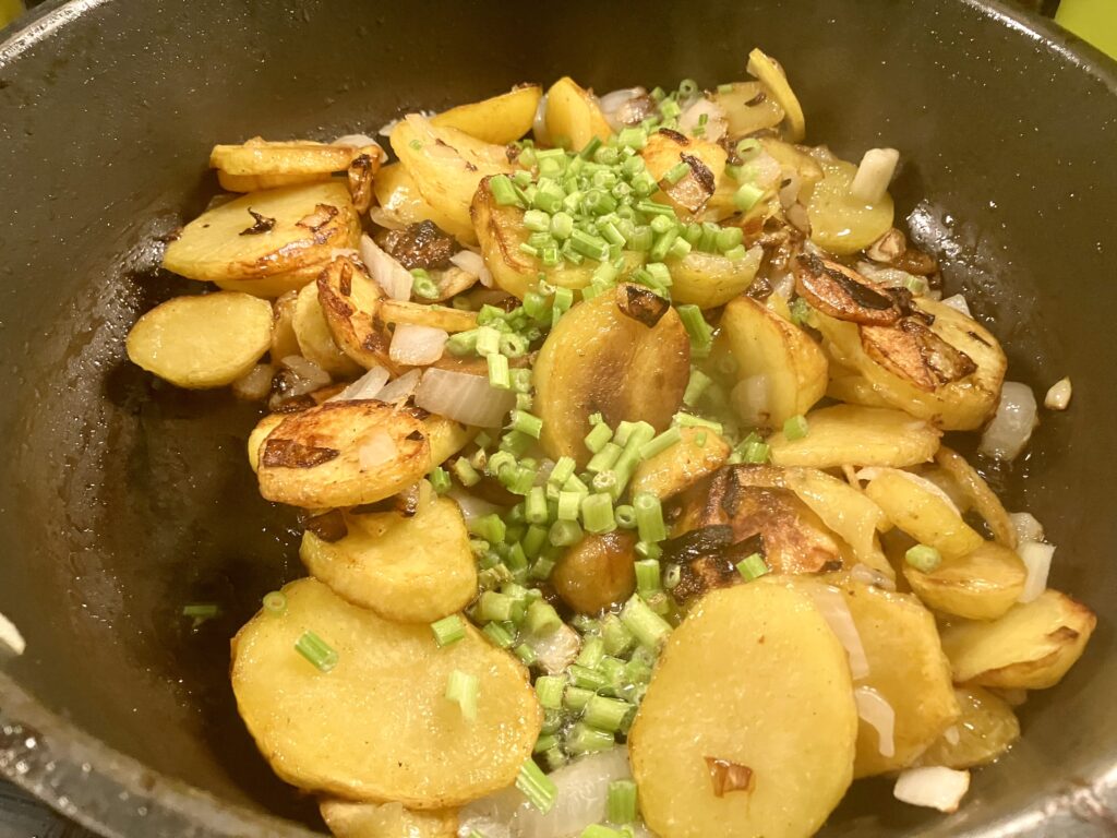 Kartofeln anfangen bei Vollgas zu braten. Je brauner sie werden, desto mehr gehen wir mit der Temperatur runter. Alle 3 Minuten wenden.