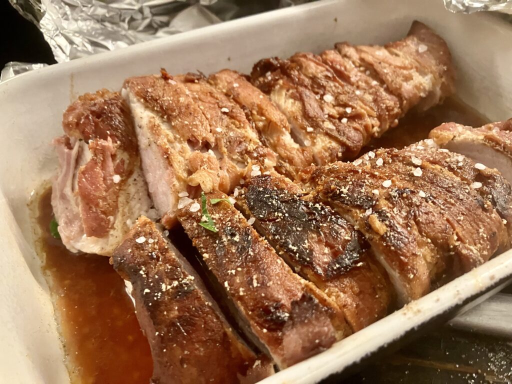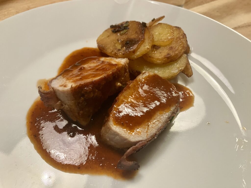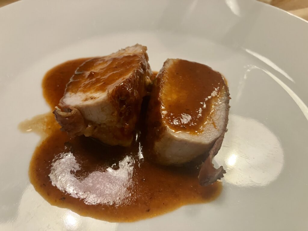 Ich hatte 2,5 Kilo Schweinerücken im MHD Verkauf für 4 Euro pro Kilo vom Handelshof. Aus dem Rest habe ich dann in diesem Rezept ein leckeres Gericht, mit dem Rest meines zwei Euro pro Kilo MHD Bacons gemacht. Dazu aus dem Bratensatz eine leckere Soße gekocht, auf Bratkartoffeln und mit Spiegeleiern rustikal serviert. Das ist ein schneller Stunt für die Woche, der so lecker ist, dass er auch am Wochenende funktioniert.