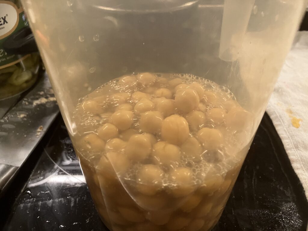 Kichererbsen mit der Flüssigkeit in einen schmalen und hohen Mixbecher füllen.