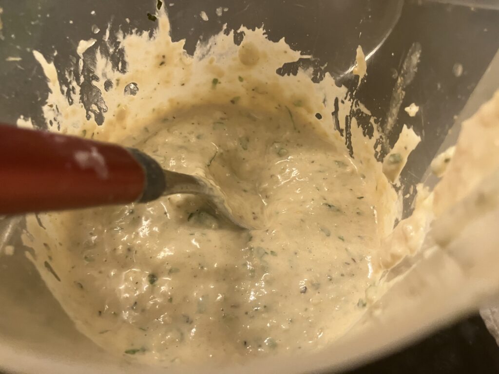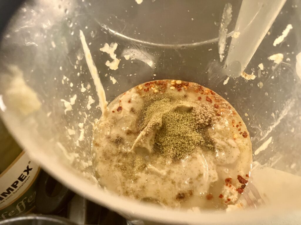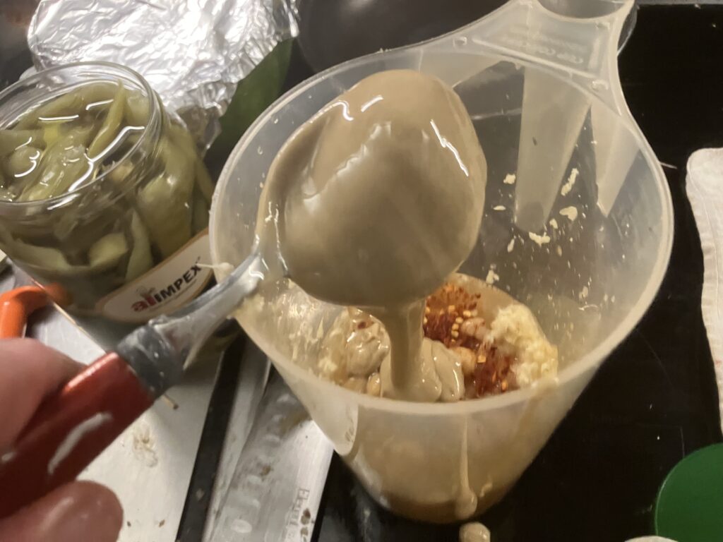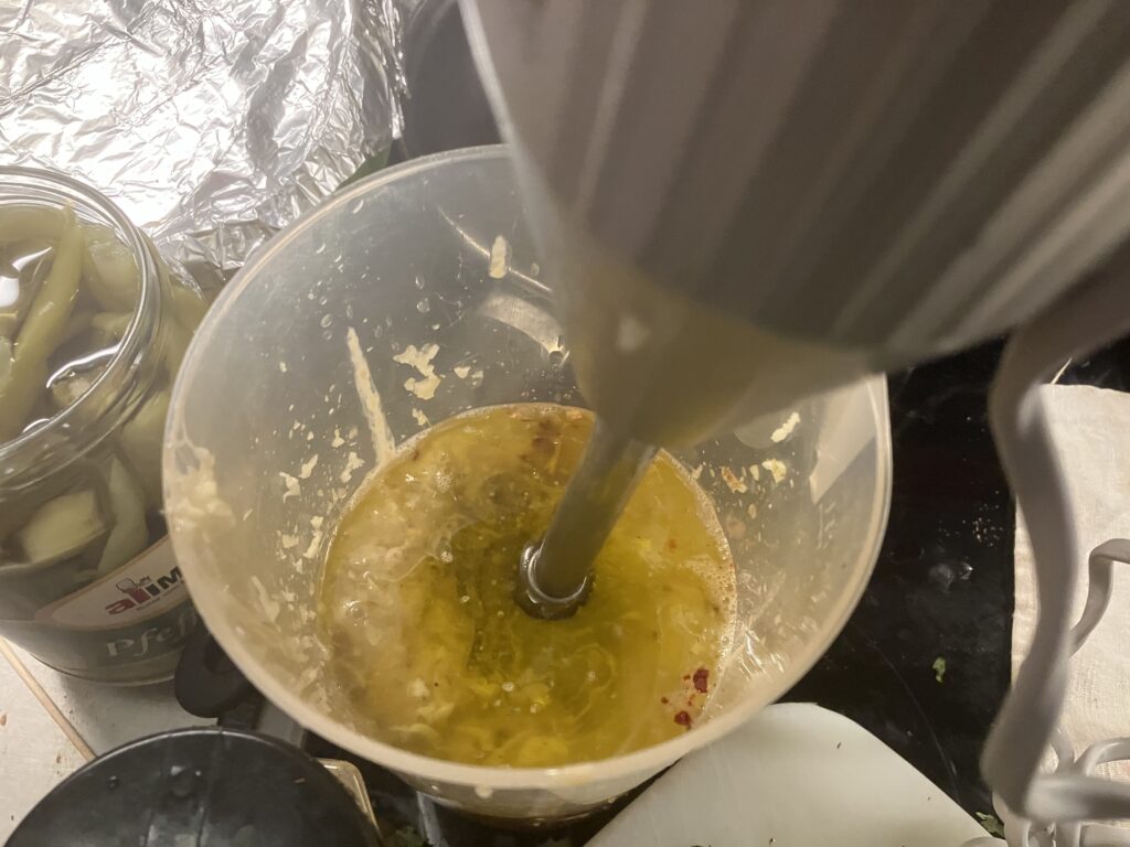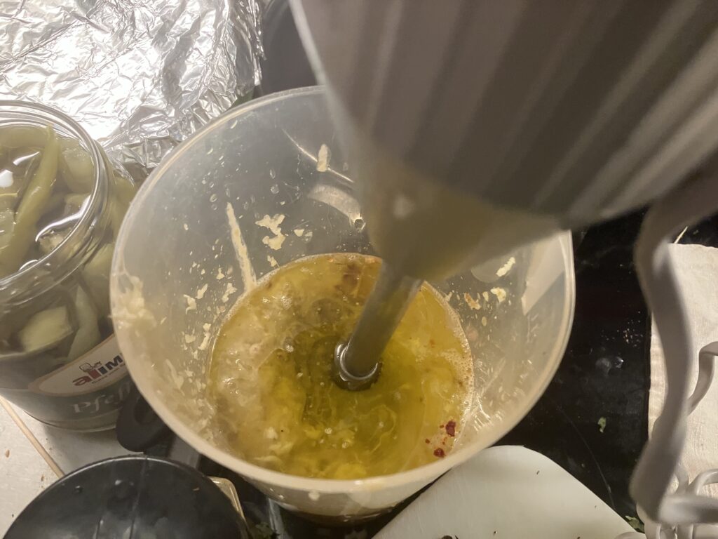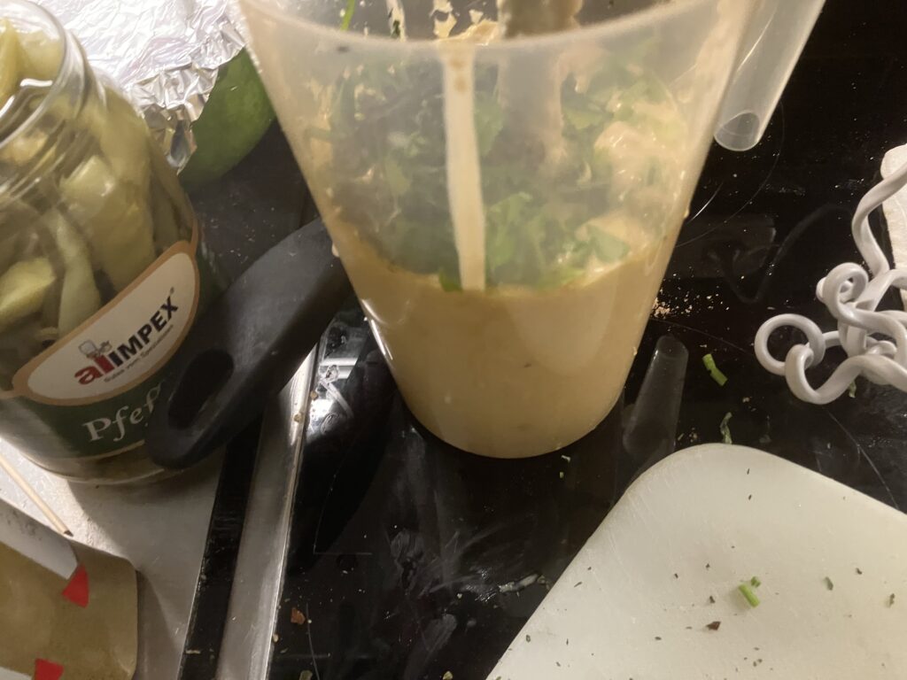 Grün, grün, grün ist alles was ich hab. Petersilie schadet nie. Das ist ein sehr geiles Hummus, aber das gibt einem auch ziemlich auf die Fresse, denn es hat richtig Säure und die braucht es auch gegen das Bittere vom Olivenöl. Wenn Ihr nicht so auf bitter steht, dann ersetzt das Olivenöl zumindest teilweise durch Rapsöl. Das ist so schon ein ziemlicher Stiefel.