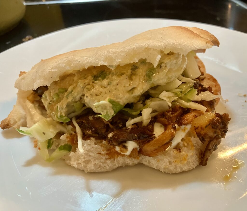 Die volle Litanei mit Gyros aus Austernpilzen, mit ohne Fleisch. Der Saal tobt.