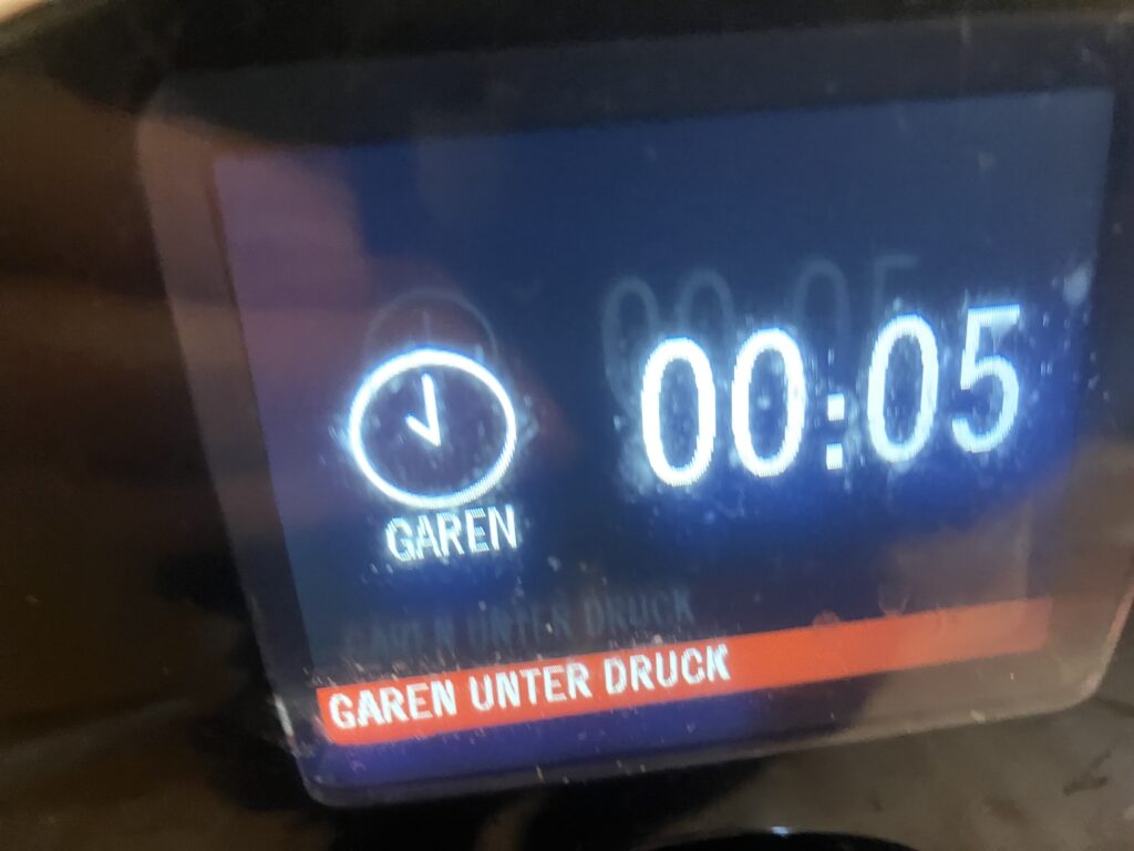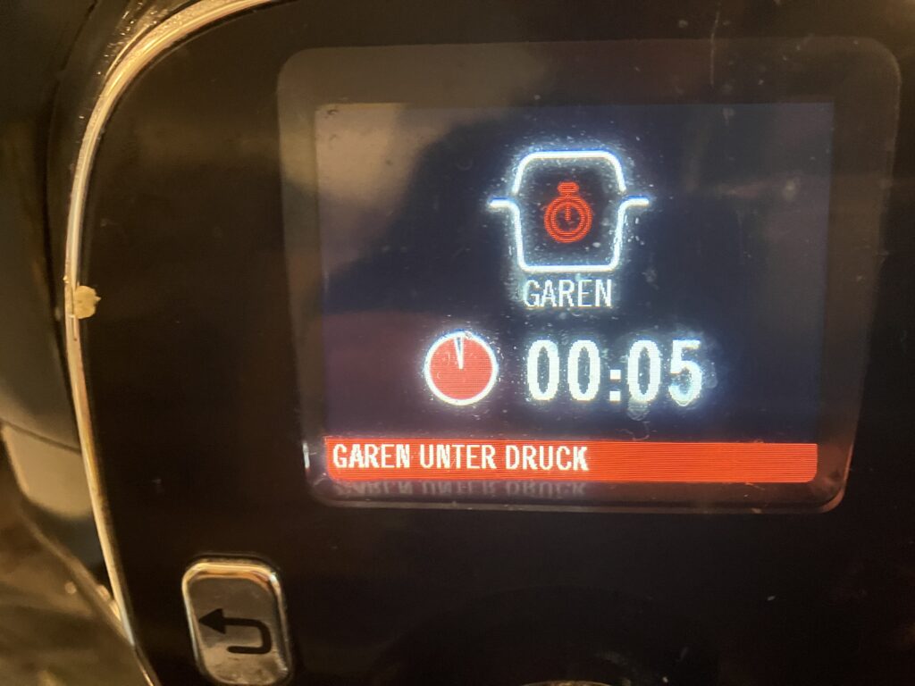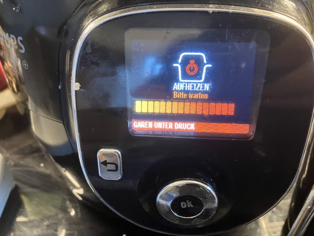 Die Kartoffeln koche in fünf Minuten unter Druck in meinem Krups cook 4 me. Schnellkochtopf sind auch 5 Minuten und konventionell werden es 25 Minuten sein, ab dem Zeitpunkt wenn es kocht