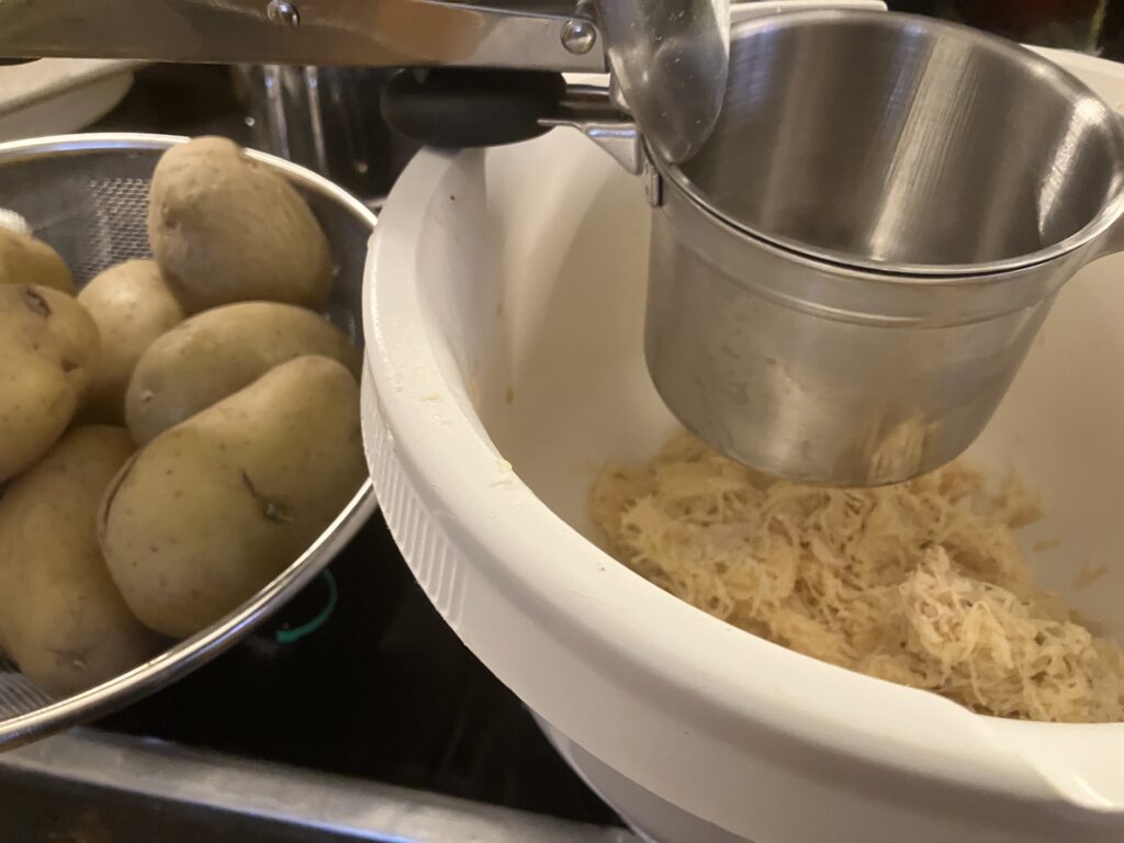 Kartoffeln durch die Kartoffelpressen drücken