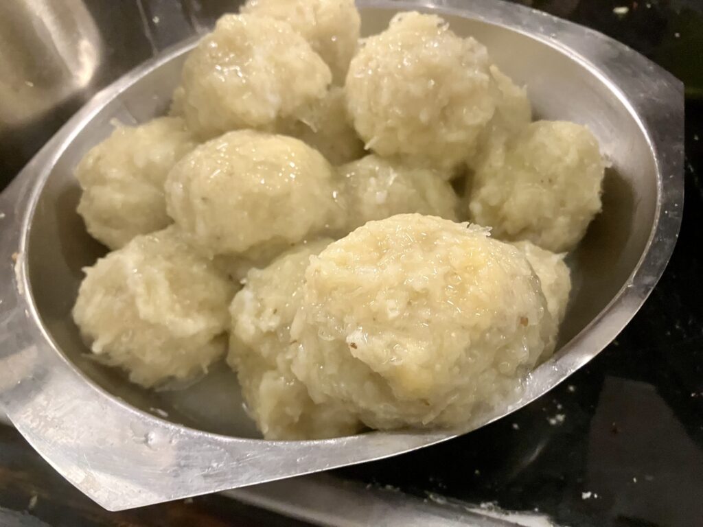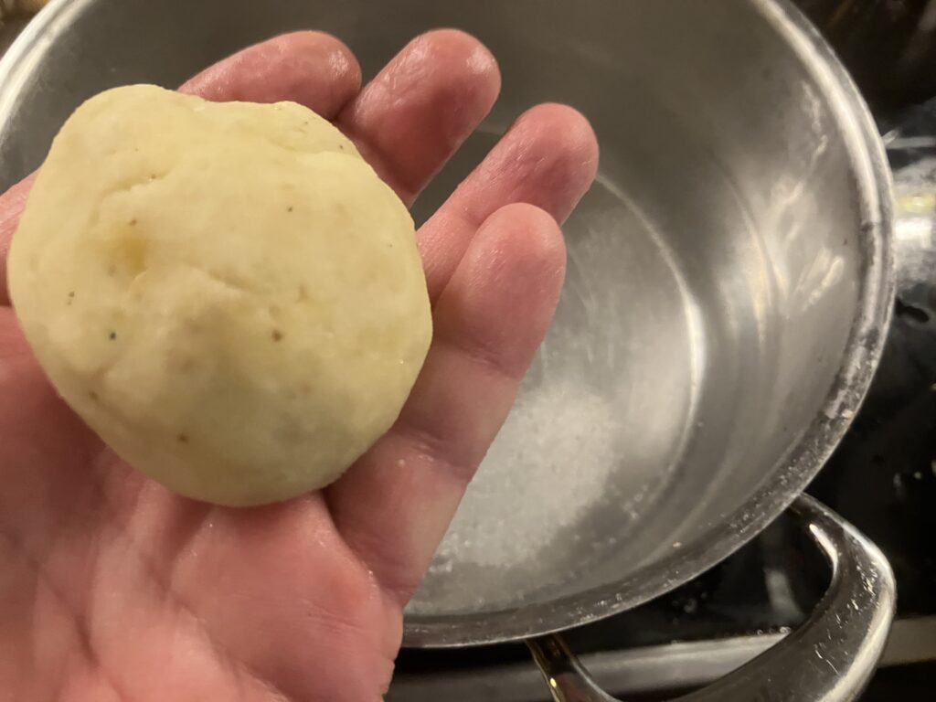Mit einem Esslöffel steche ich Kartoffelteig ab und mache mit feuchten Handflächen einen glatten Kloß